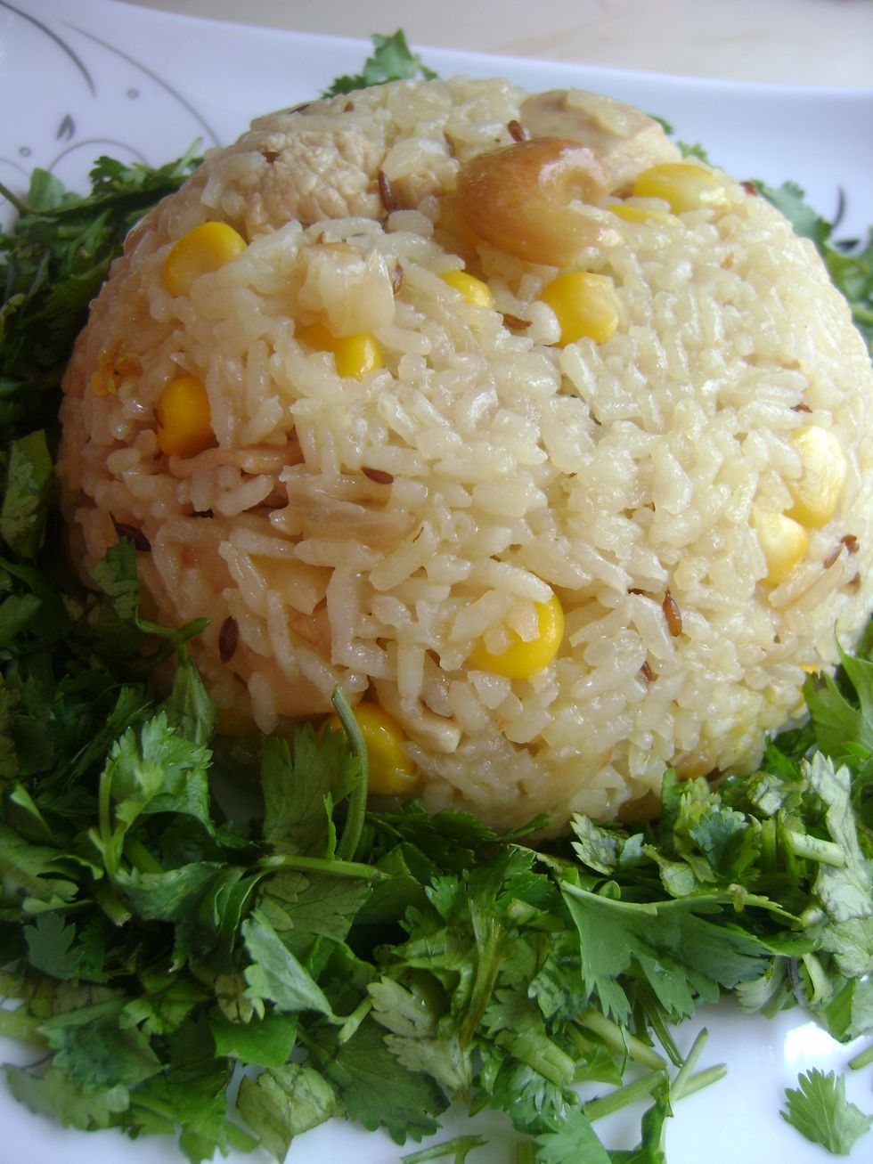 1 1/2 cups rice, 1 cup sweet corn, 1 cup boneless chicken pieces, 1 small chopped onion, 4 cloves of chopped garlic, 4 cups chicken stock, salt to taste.