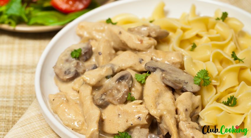 Chicken stroganoff is a fun spin on your favorite beef Stroganoff. Everything you love about the beef dish is featured here. Tender chicken thighs are browned first then smoothed with a mushroom, onion, and sour cream sauce, and served over noodles.