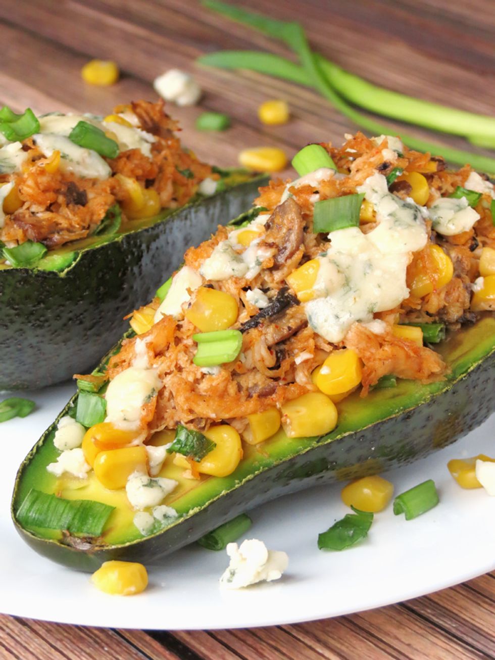 These avocado halves are filled with a tasty mixture of chicken, corn and mushrooms. They are perfect for a quick appetizer!