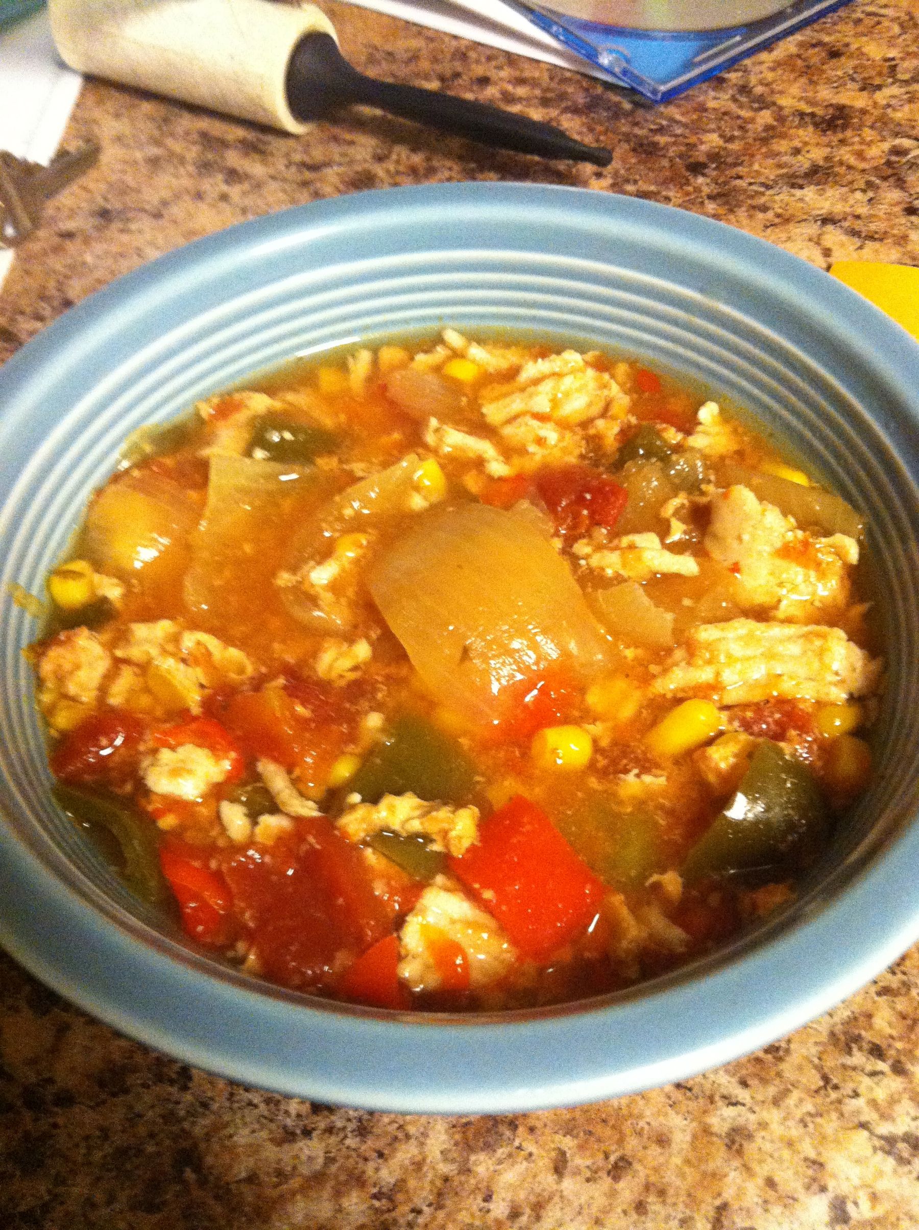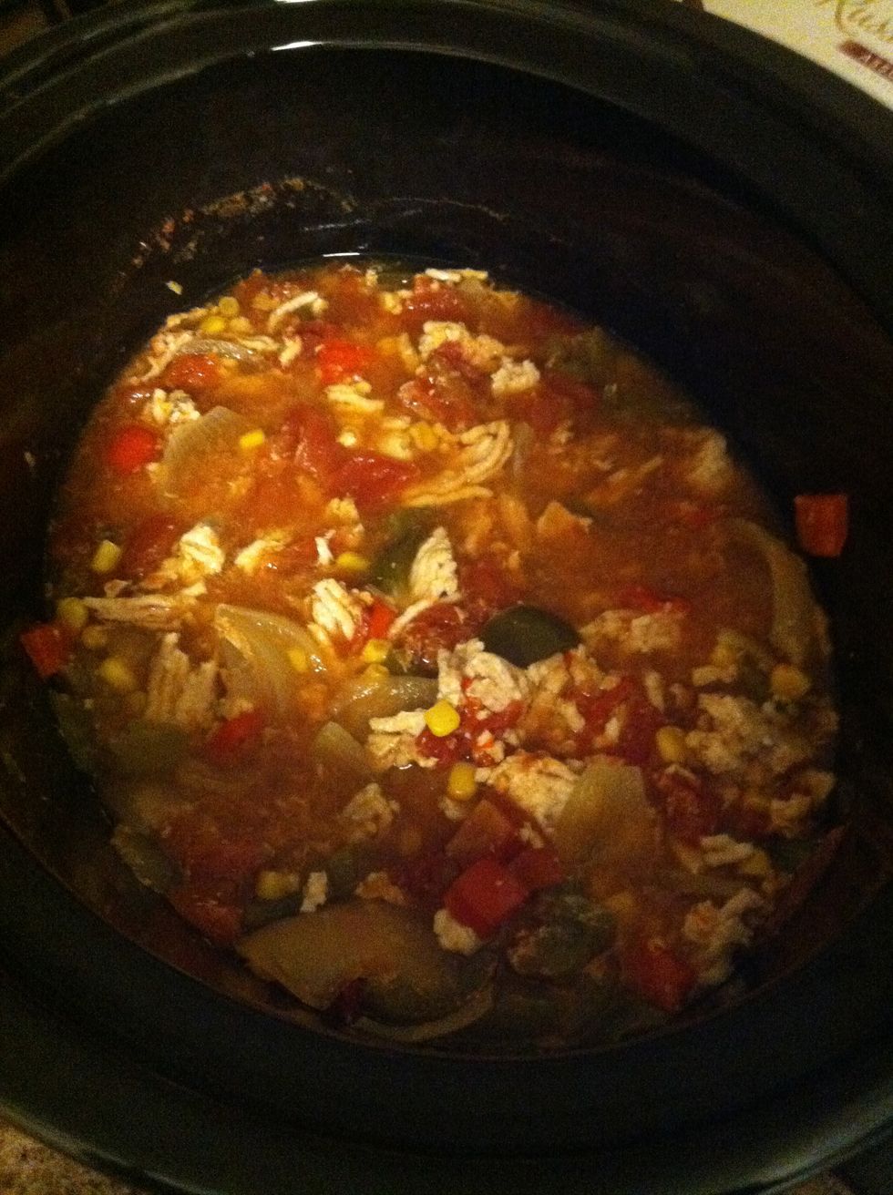 Spread onions out on the bottom of slow cooker. Add corn, tomatoes, and garlic. Mix well to combine. Finally place chicken on top of tomato mixture. Combine broth and tequila in separate bowl. Pour over combined chicken and tomatoes. Slow cook on LOW for 8-10 hours. After 8-10 hours, cut up chicken (either right on top of mixture or out on cutting board), then stir together. Finally serve! You may put cilantro or sour cream on top to enjoy :)