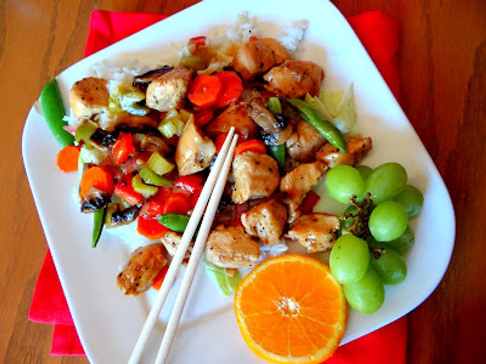Chop up the veggies you like and stir fry in a little oil and salt and set aside. Cut up your chicken and sprinkle with a little lemon pepper or Lawry's season salt and fry up in a Wok or fry pan. When done...