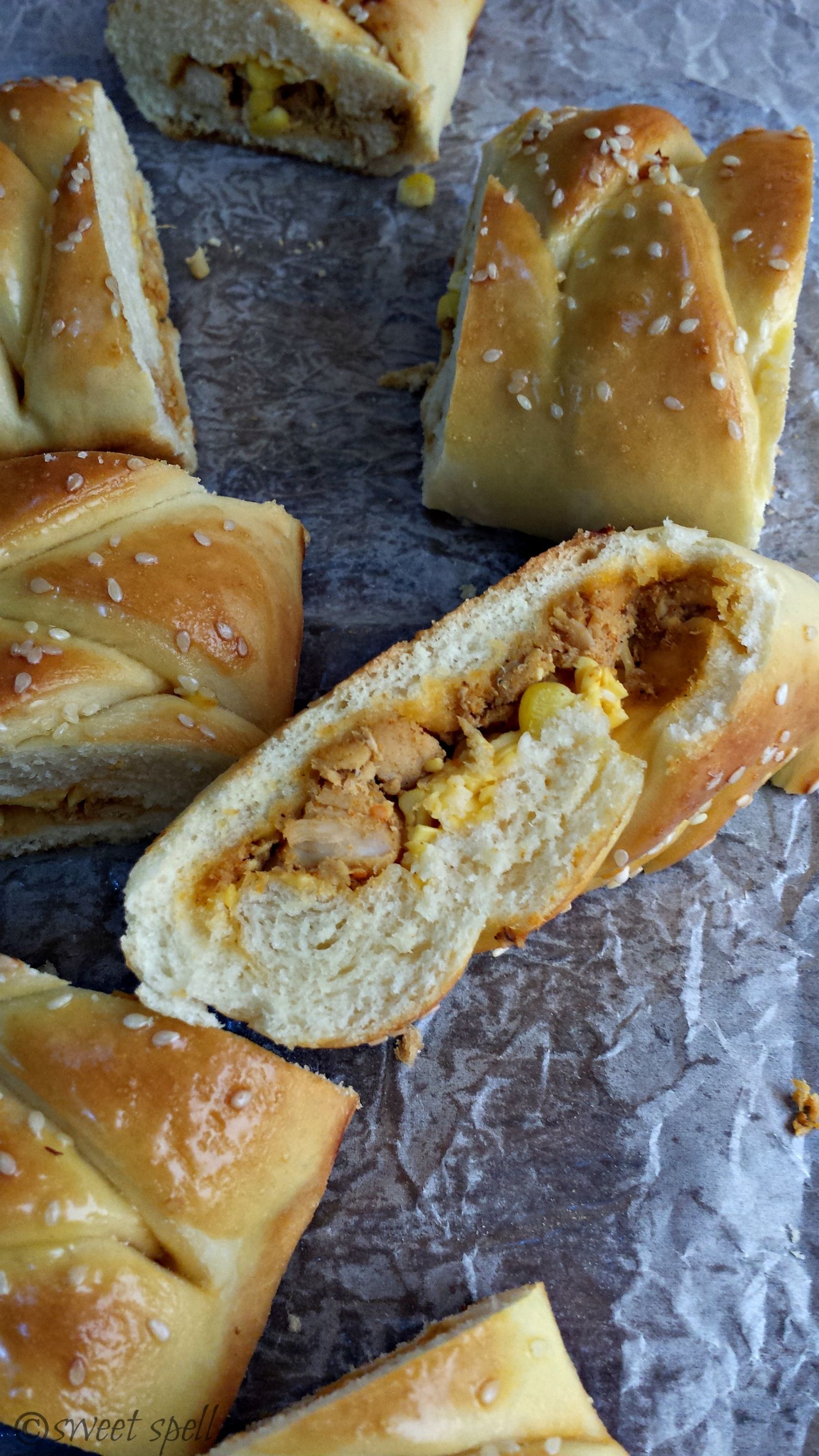 Prepare yeast dough. Cut the chicken into small cubes. marinate with ginger, garlic and tikka masala ; set aside. in a medium size saucepan over a medium heat , add in oil and marinated chicken cook the...
