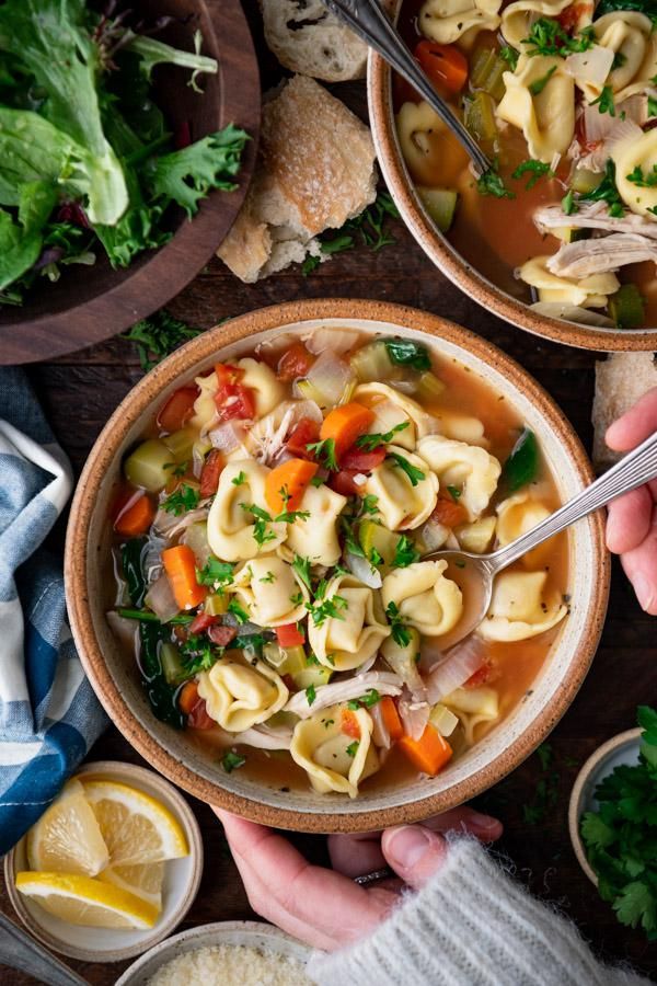 A warm bowl Chicken Tortellini Soup is the perfect easy dinner recipe for a chilly day! Loaded with Italian flavors, chunks of chicken, cheese-filled pasta, and plenty of vegetables like spinach, tomatoes, and zucchini, this hearty homemade soup is a healthy option that will keep you satisfied. Serve each warm bowl with a loaf of crusty bread, garlic breadsticks, or a simple green salad.