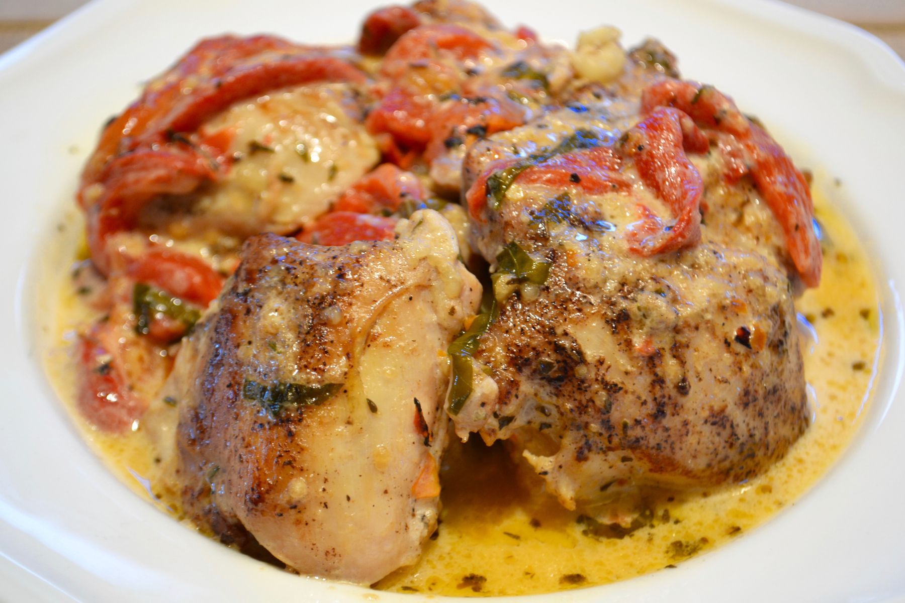 Chicken thighs drowned in a roasted red pepper cream sauce that is good enough to drink with a straw.