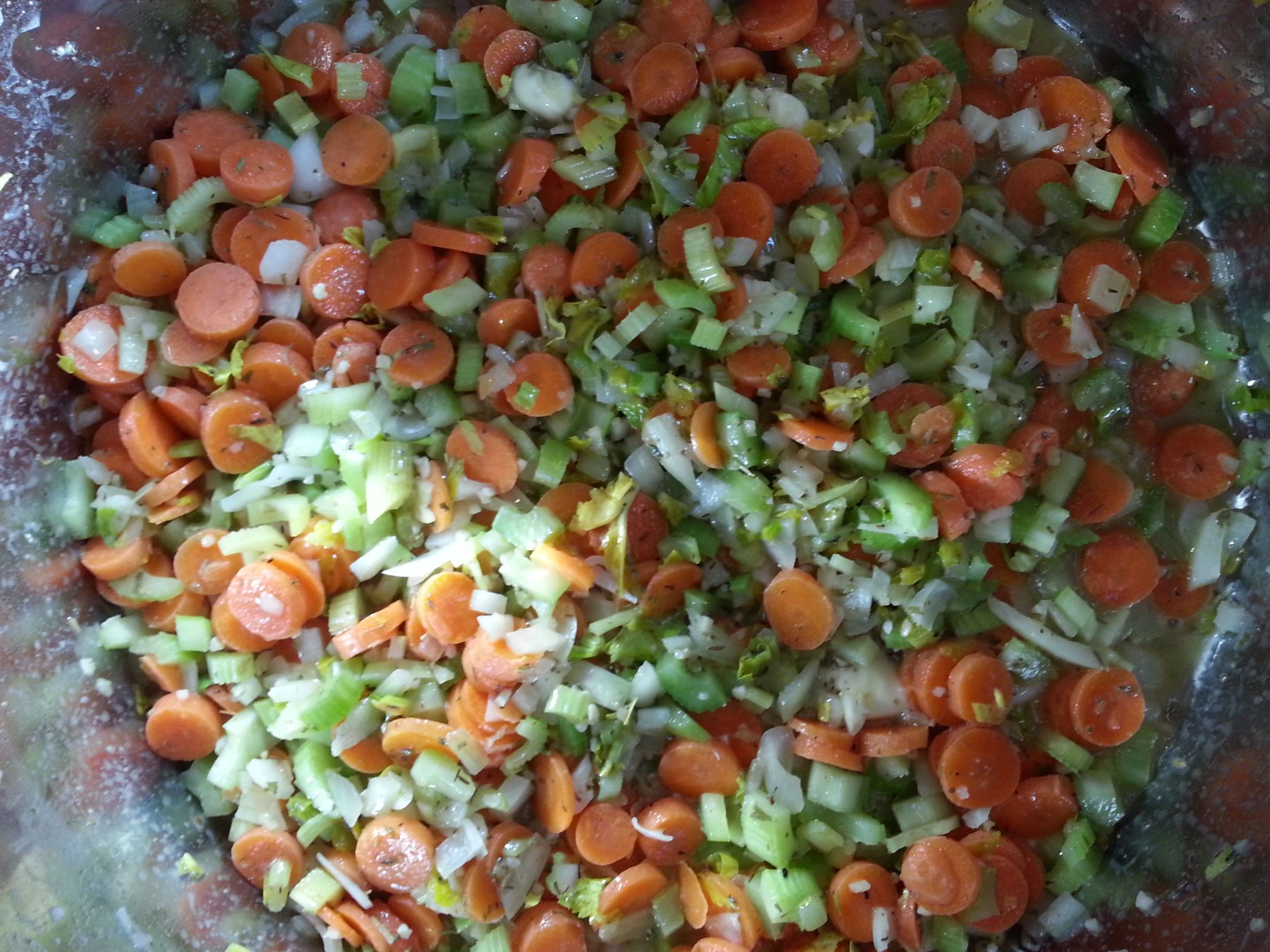 Slice up the fresh, raw onion, carrots, celery & mushrooms, keeping mushrooms seperate.
