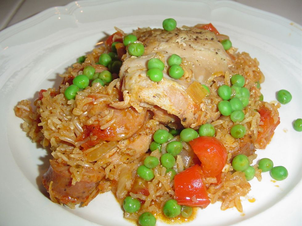 Heat the oil in a large skillet with a lid. Season both sides of the chicken with salt and pepper and brown in the oil. Remove the chicken from the pan and add the onion, pepper, garlic and sausages. Cook...