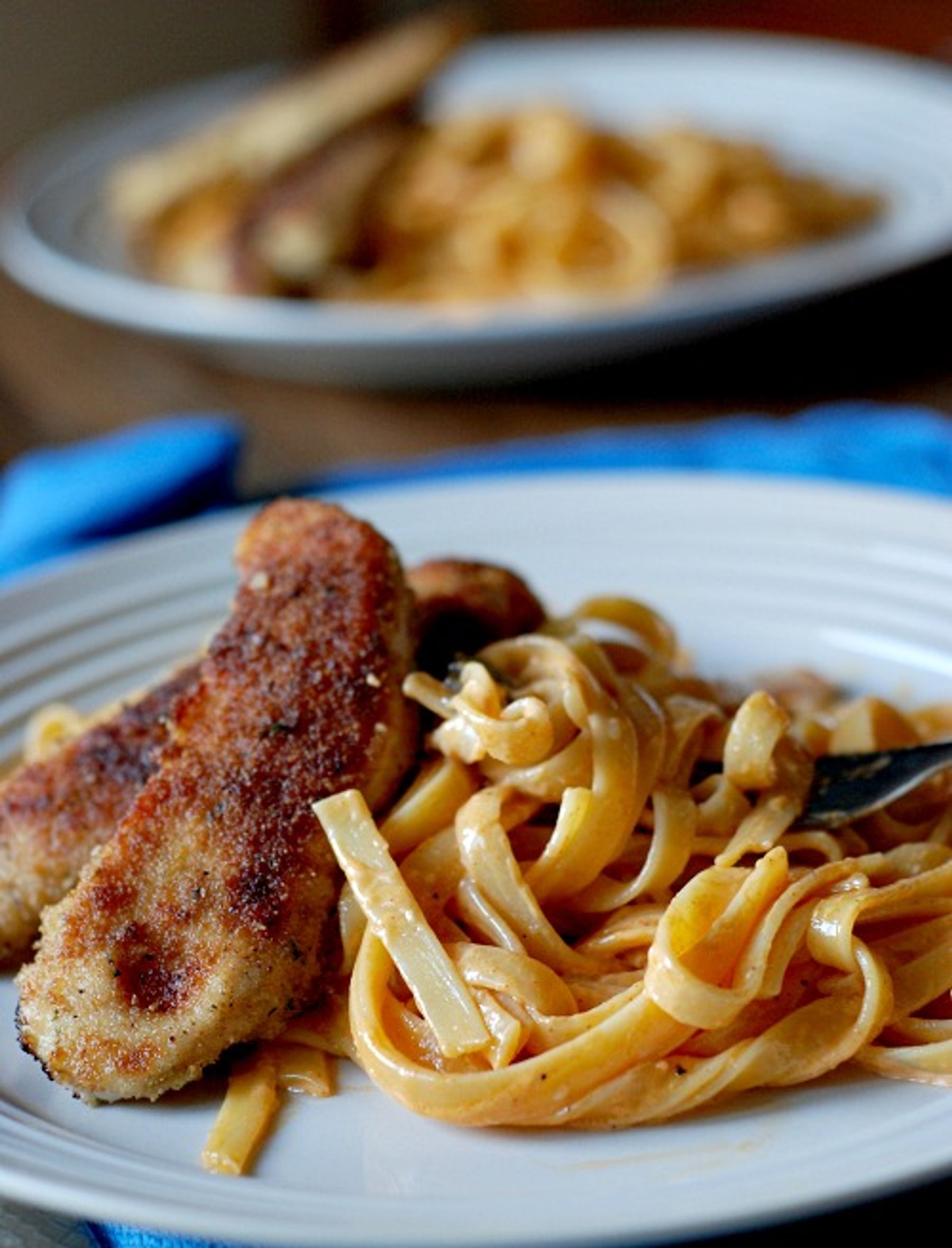 Pan Fried chicken served with a creamy buffalo flavored alfredo fettucine.