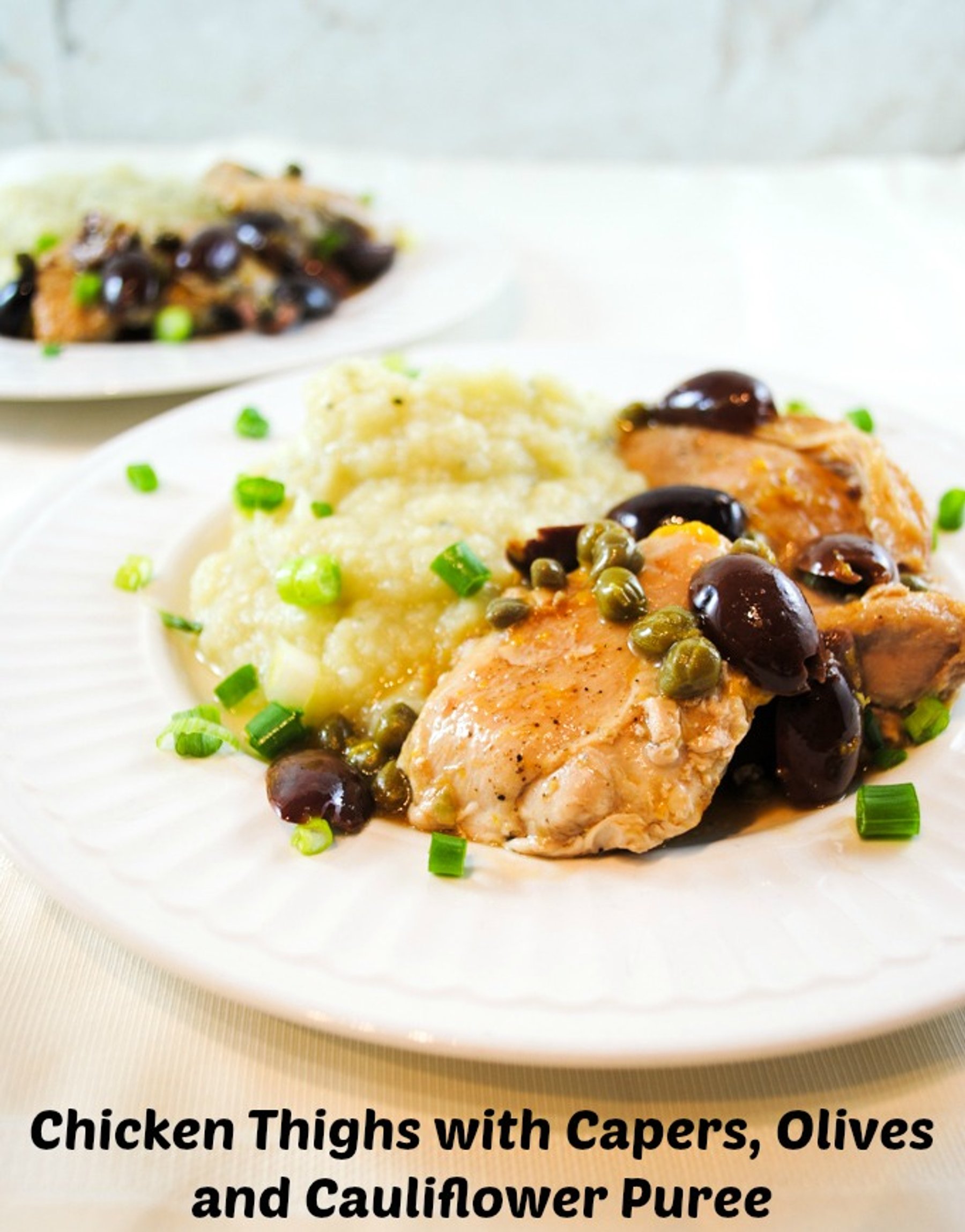 Served with pureed cauliflower, these moist and tender boneless chicken thighs with olives, capers, and fresh lemon make an impressive calorie-friendly meal.