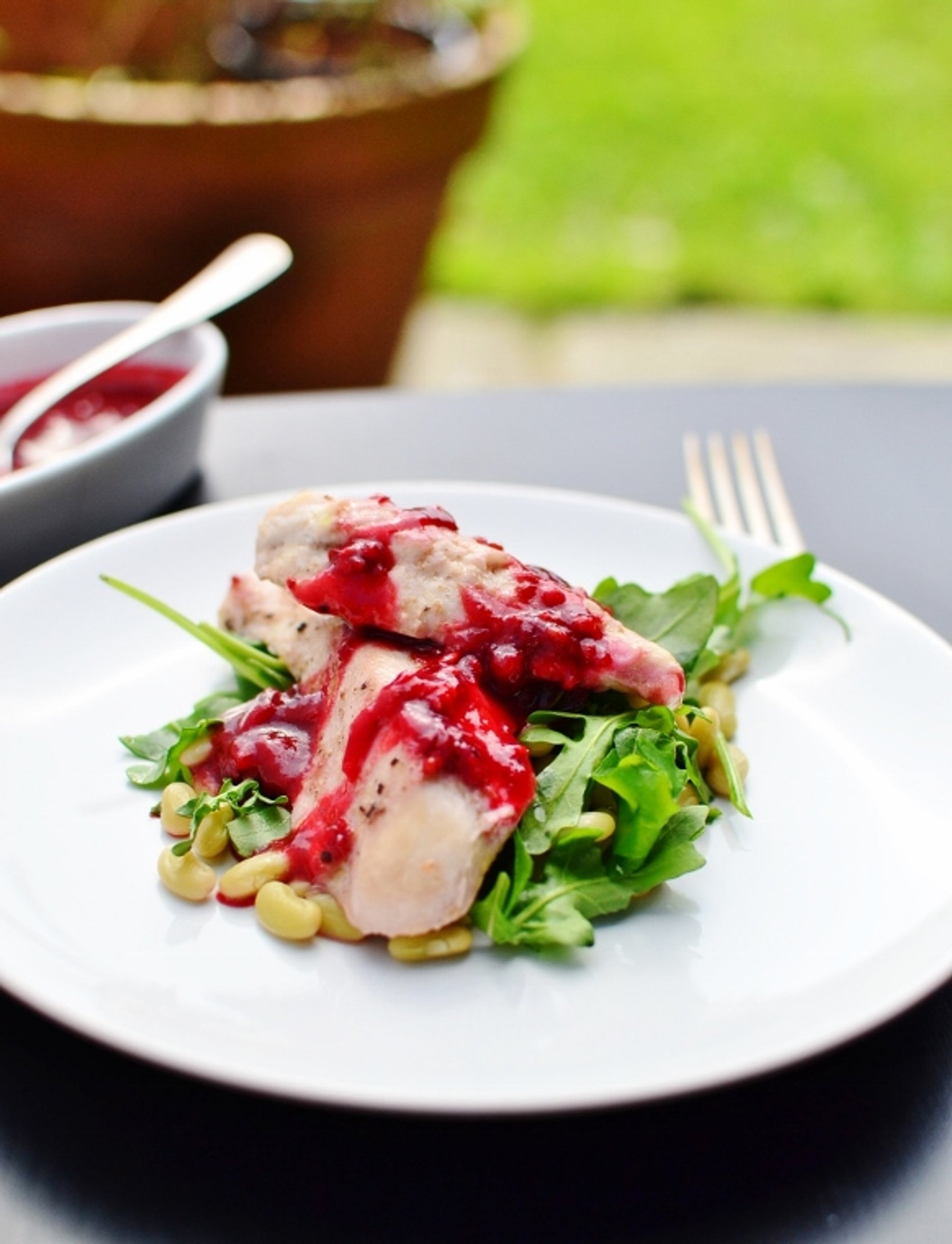The gravy is very quick and easy to make, has only 4 ingredients and goes really well with the chicken. You could puree the sauce for a smooth finish if you like; I prefer a more rustic dish with the little slightly cooked redcurrants floating in the silky gravy.