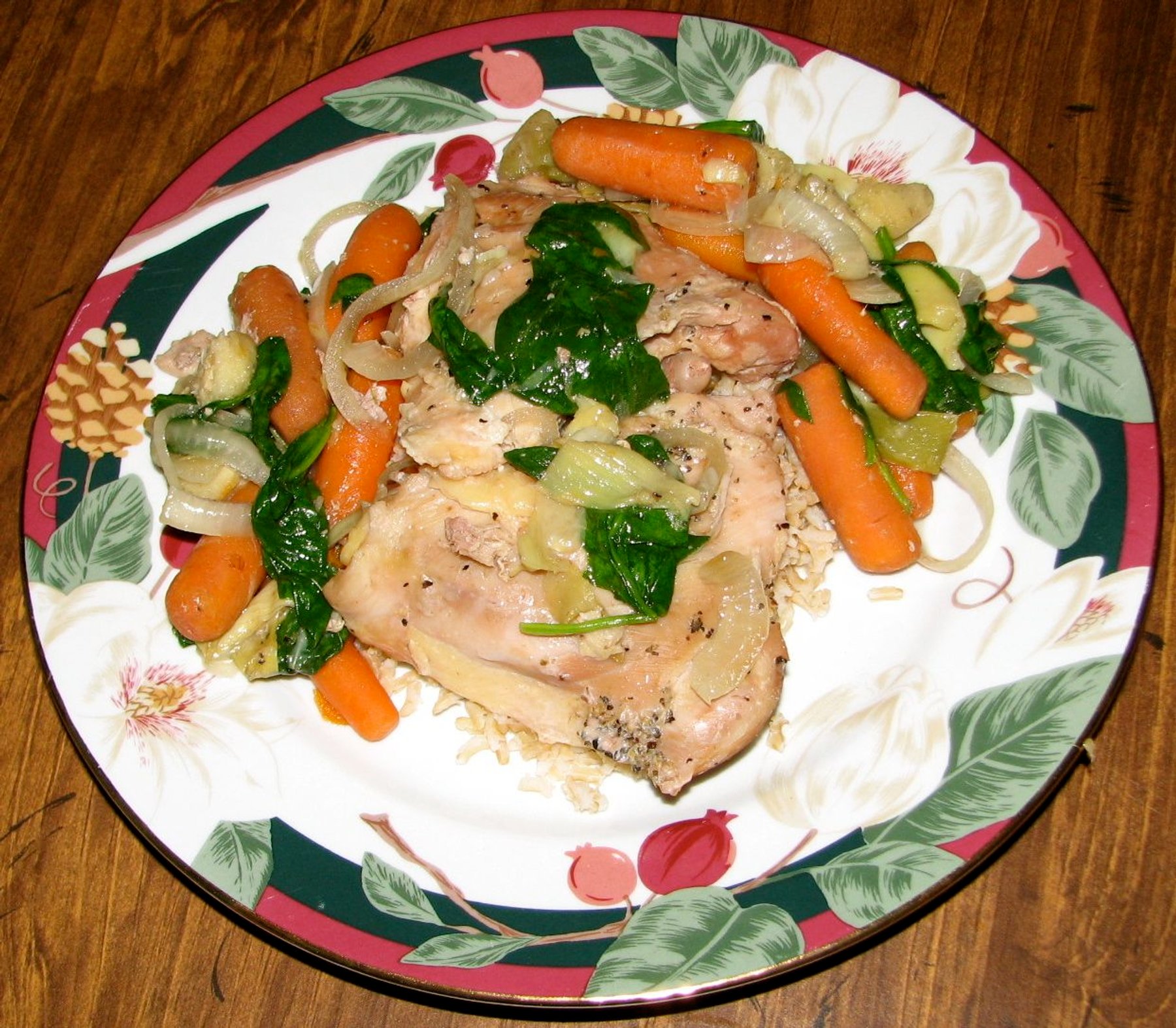 Place the chicken pieces in a 6 qt. crock pot then season with salt, pepper and 1 1/2 t. Italian seasoning. In a large bowl combine the onion, artichoke hearts, carrots, garlic, salt, pepper and remaining 1...