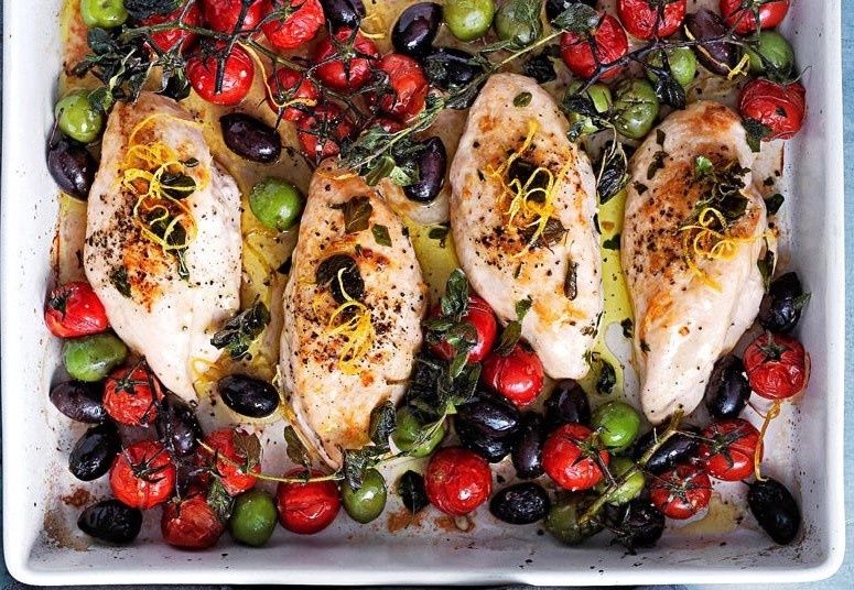 - Preheat the oven to 220°C (425°F). Place the chicken into the large ovenproof baking dish. Top it with the tomatoes, olives, oregano, lemon zest, lemon juice, oil, salt and pepper.