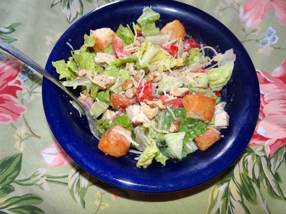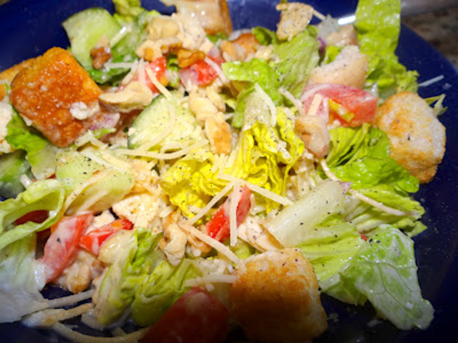 Cut up all the veggies and lettuce and place into 2 salad bowls. Add the fresh Parmesan, the chicken and the walnuts. Add Caesar dressing and croutons and shake on some black pepper. Dig in because you...