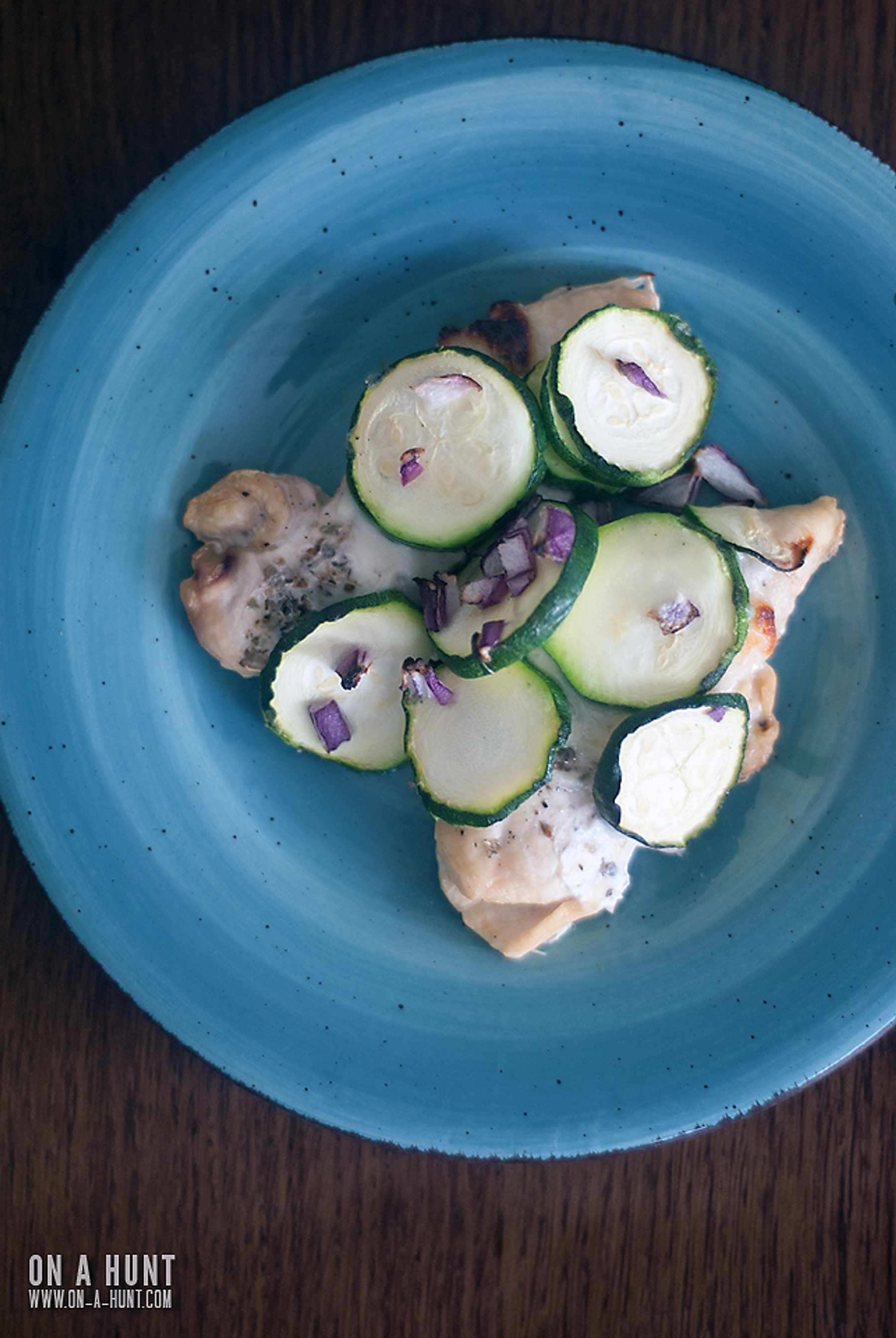 Pre-heat oven to 450. Cut zucchini and onion into slices. Arrange chicken breast onto non stick baking pan. Sprinkle chicken with salt, pepper, and oregano. Sprinkle cheese onto chicken. Arrange sliced...
