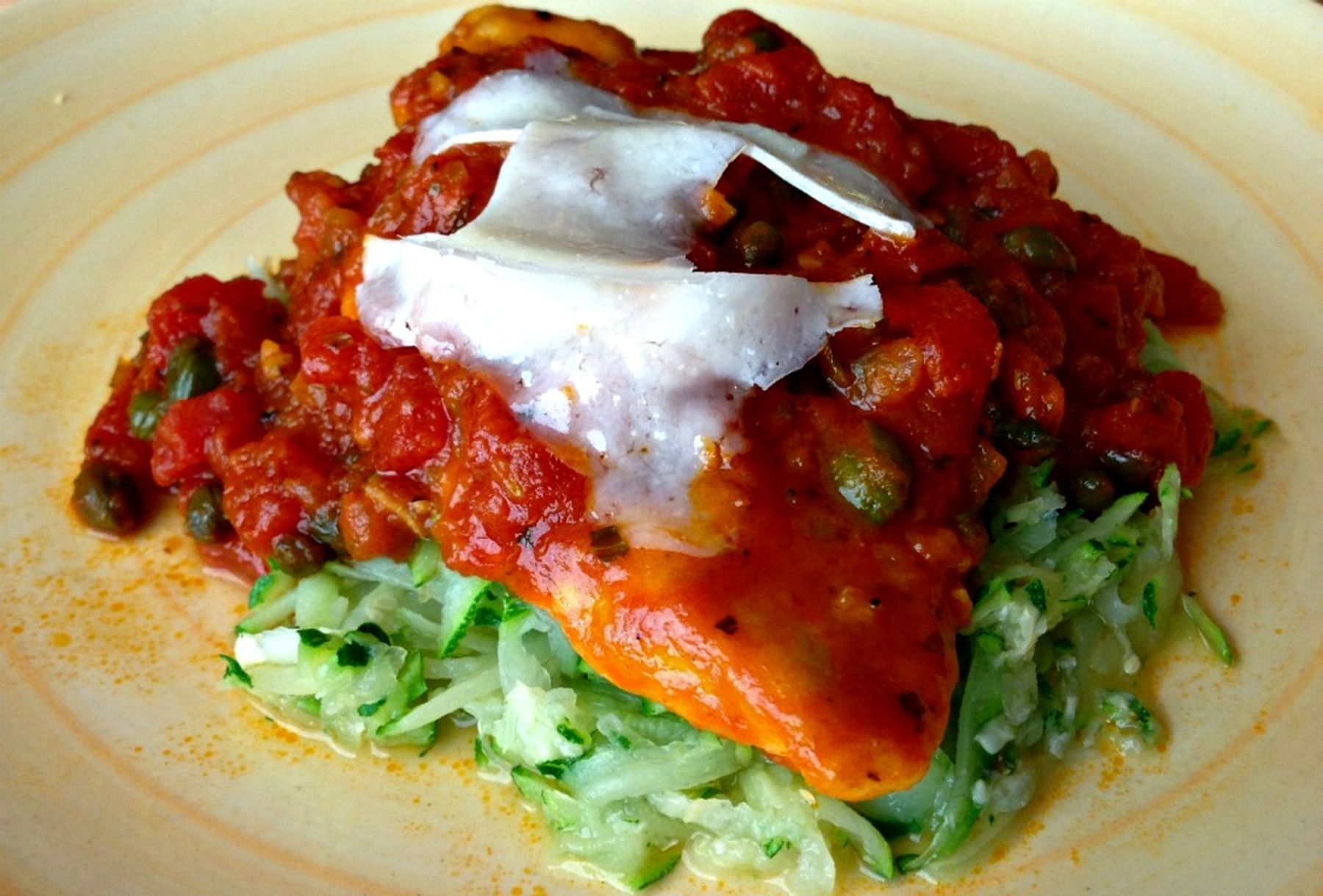 A lightly breaded chicken breast served over garden fresh zucchini with a slow simmered sauce.