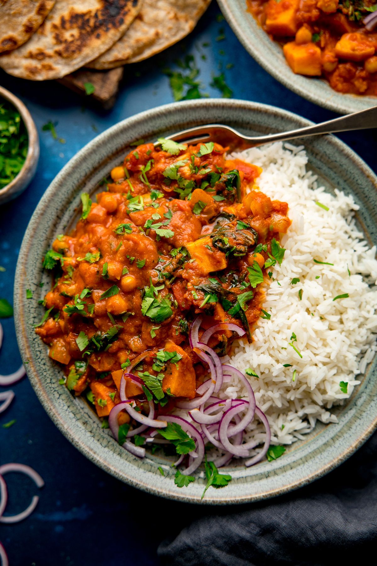 Chickpea and Sweet Potato Curry Nicky CorbishleyJuly 08, 2020 662 Kitchen SanctuaryAn easy, rich, fragrant curry with chickpeas, sweet potato and spinach, cooked in a creamy coconut curry sauce. Ready in 35 minutes.Chickpea and Sweet Potato CurrySee the full directions on my site