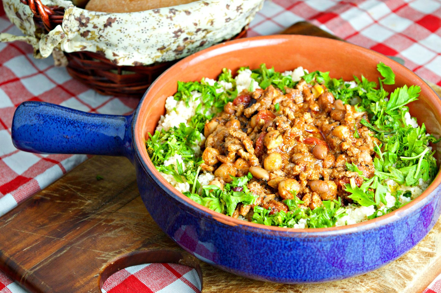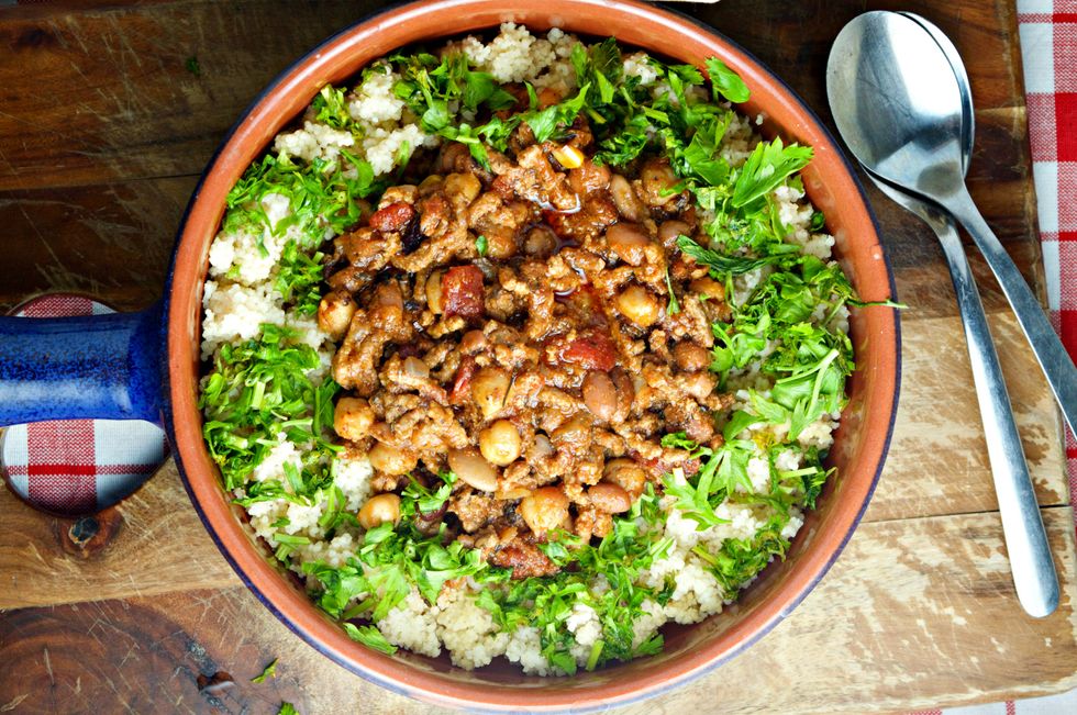 Comforting and heartwarming chilli on a bed of couscous with freshly chopped parsley