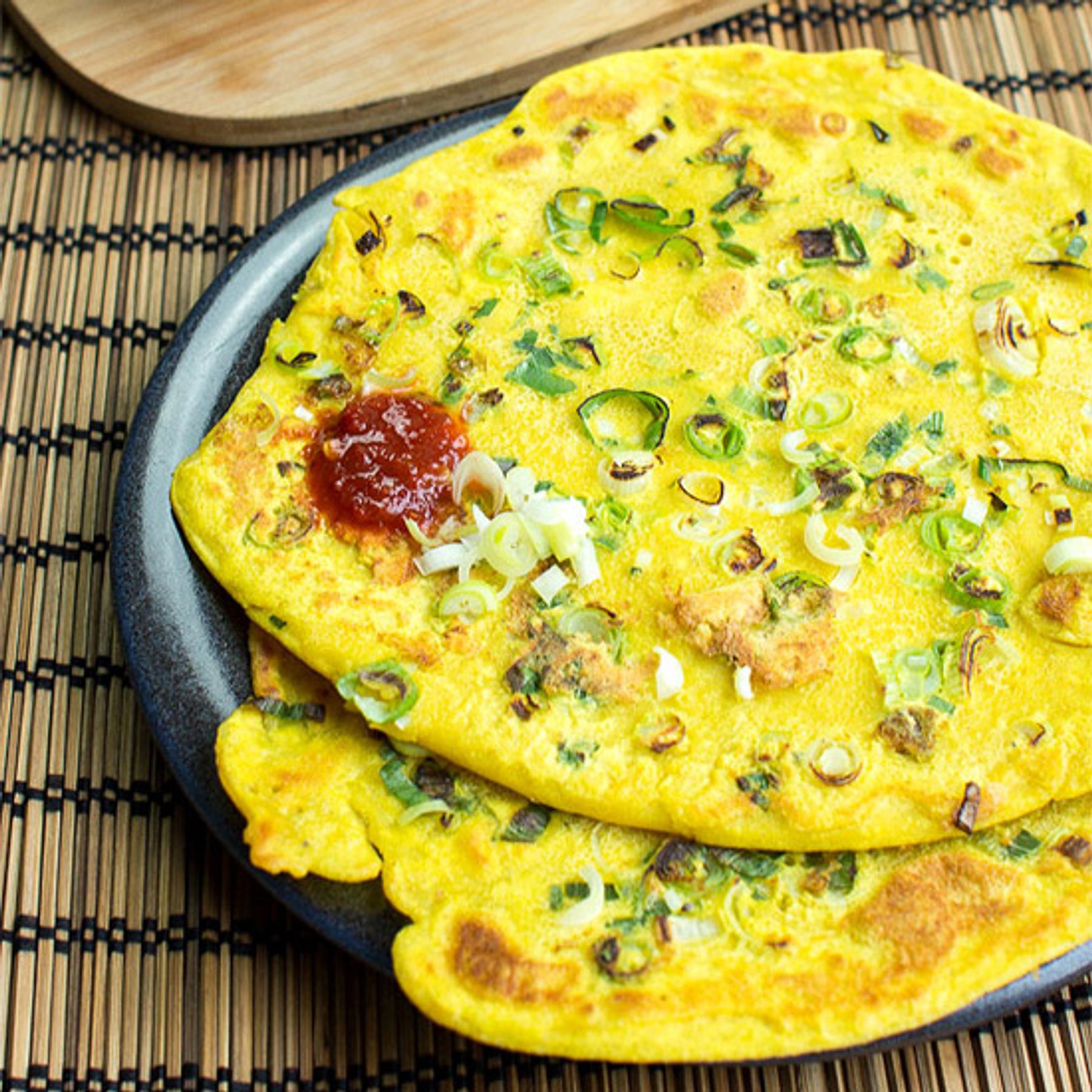 A fantastic savory pancake begging to be eaten with pickles and chutneys or yogurts and cream. East meets West with this beautifully, wonderfully healthy dish.