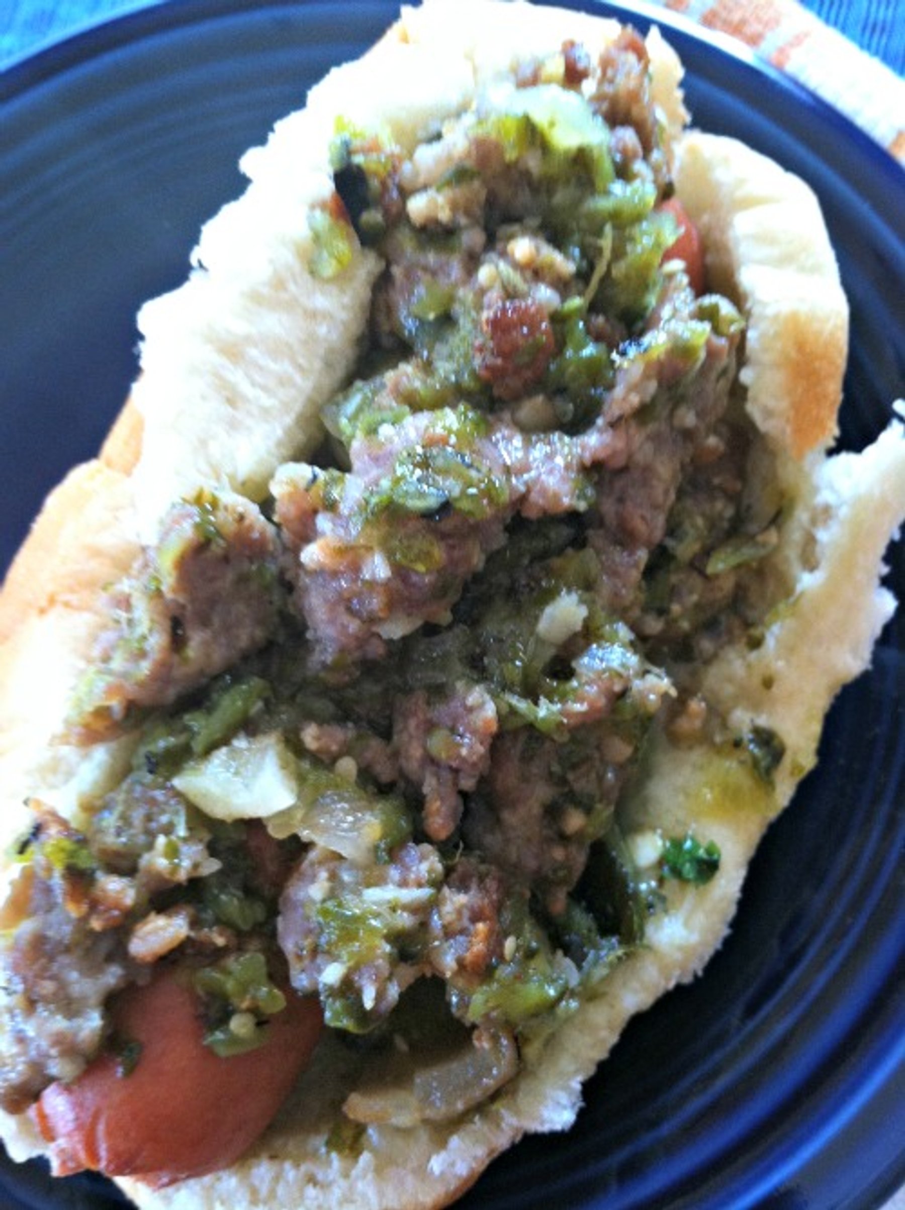 A southwest twist on the chile dog! Chile Verde Dog!