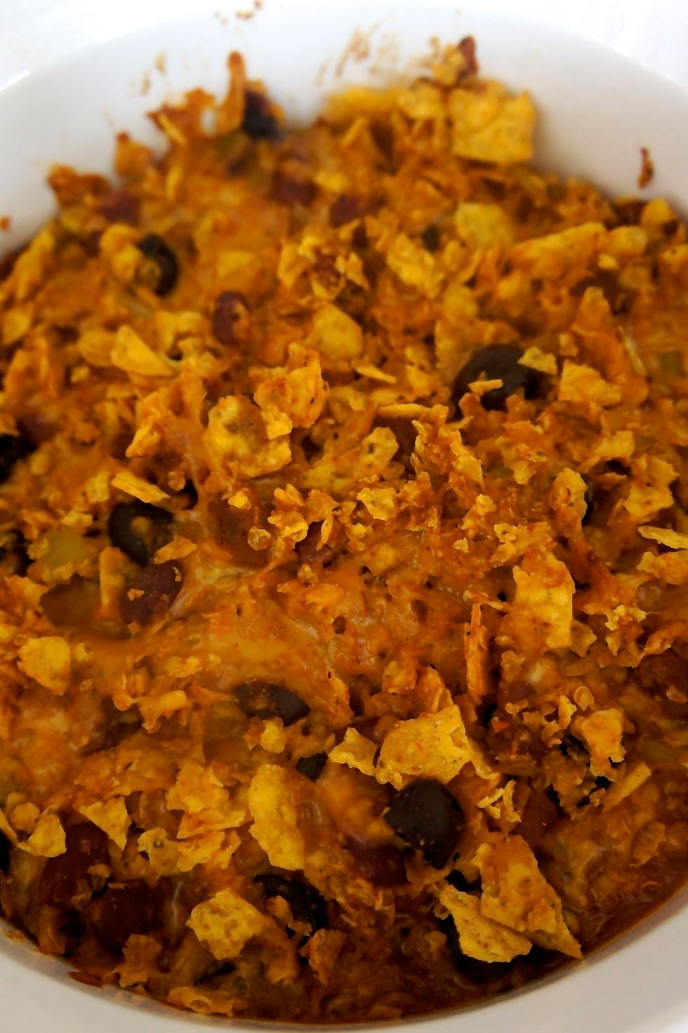 In a large bowl combine the chili, green chilies, black olives and cheese. Add in the crushed chips and stir just until mixed....