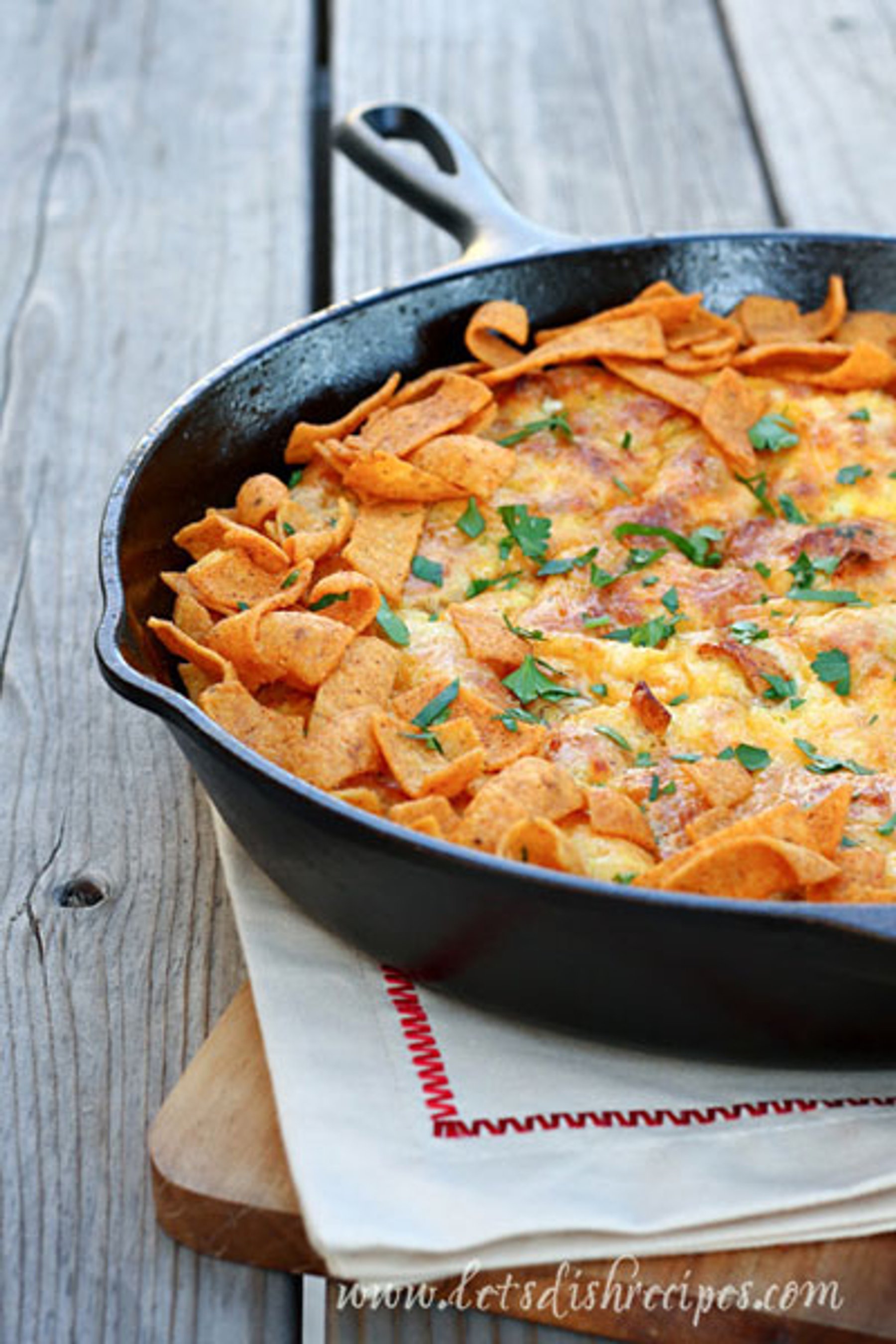 A slightly spicy frittata made with Chili Cheese Fritos and topped with cheese, perfect for breakfast or dinner.