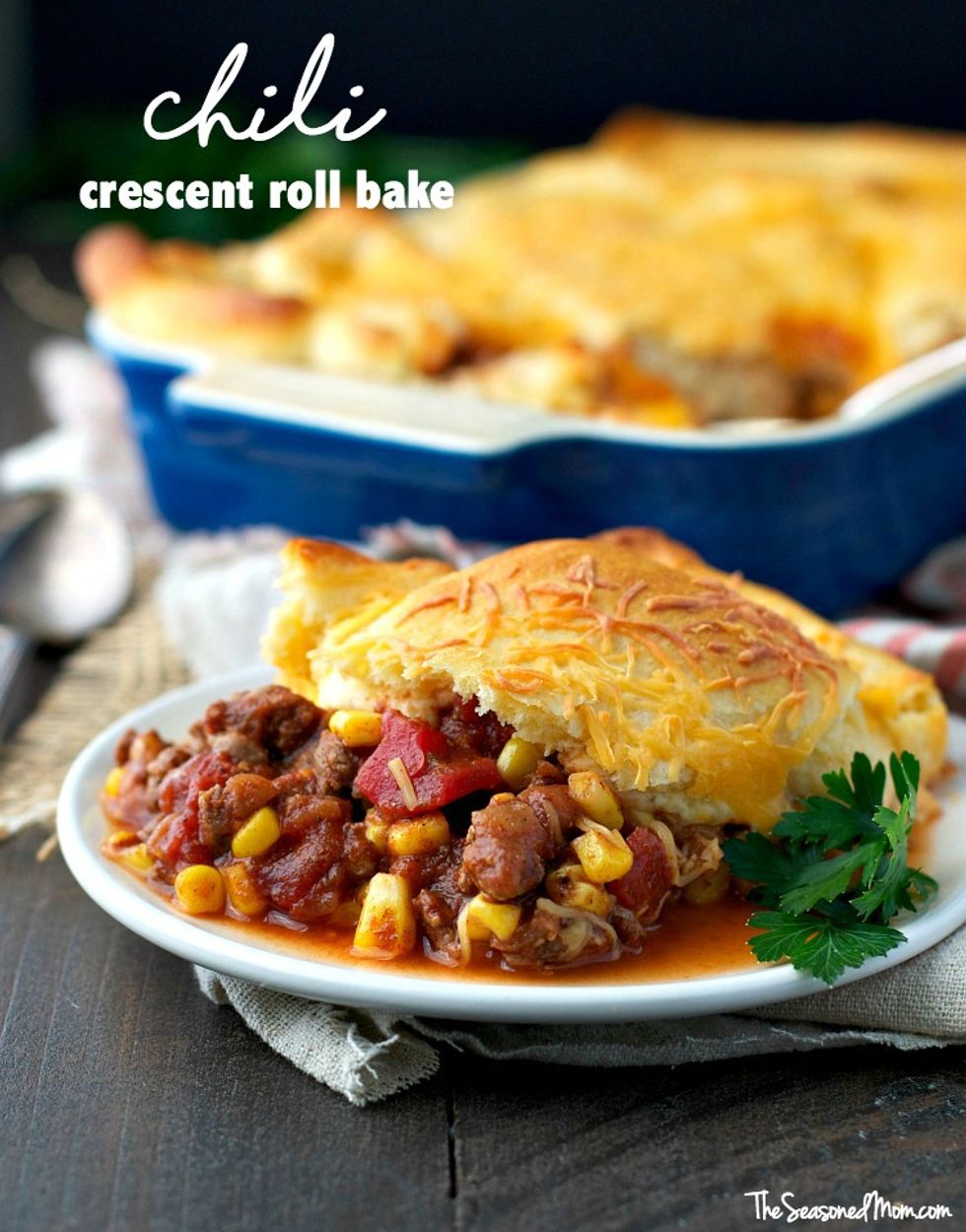 This cozy Chili Crescent Roll Bake is an easy dinner that’s ready in 30 minutes! The hearty beef and corn chili is topped with a cheesy cheddar crescent roll crust for a comfort food casserole that the whole family will love!