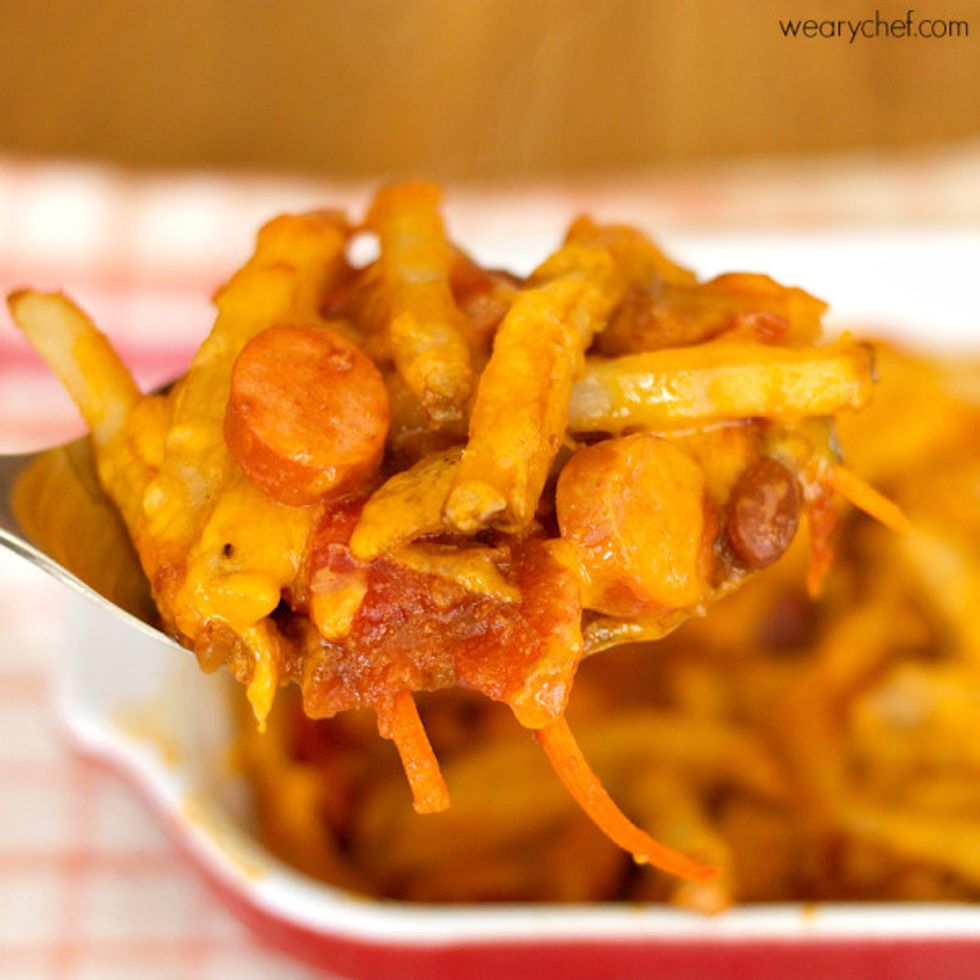 Chili Dog Casserole with Cheese Fries