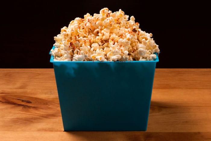 Air-popped popcorn drizzled with avocado oil and dusted with chili powder. A healthy Mexican snack.
