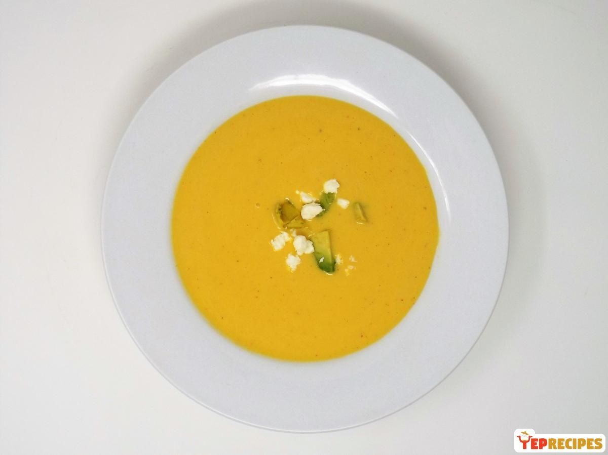A rich and smooth chilled corn soup topped with diced avocado and crumbled feta cheese.