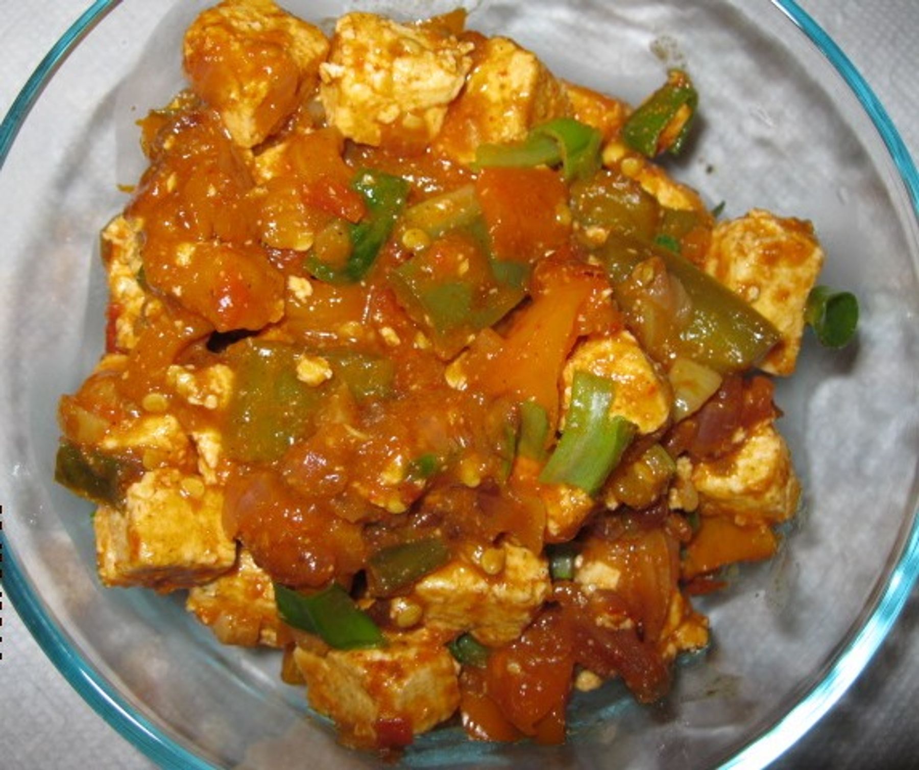 5.Once green pepper-onion-tomato mix is cooked, add paneer/tofu to the mix.Add tomato ketchup,chilly sauce, soy sauce,salt and pepper and cook for 10 minutes.Garnish it with chopped spring onions.