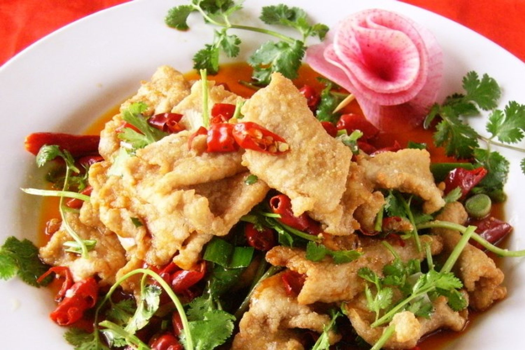 Heat the large amount of oil into a frying pan. Dress the pork slice with the starch paste evenly, and fry in the oil, until the meat surface becomes crisp.