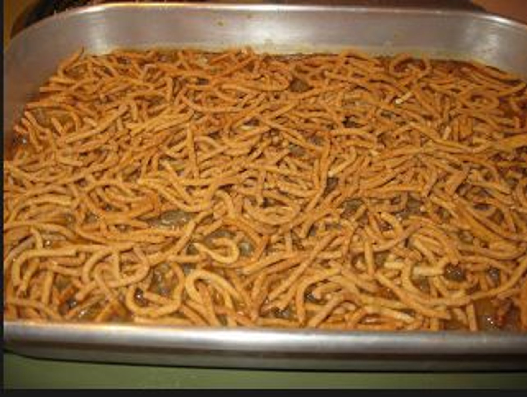 cook rice in beef stock until tender, about 15 minutes. brown ground beef and onion together until brown and crumbly. drain of excess grease. In large bowl mix soups and milk together add in the meat mixture and rice if you are using the cheese add it now. pour into greased 9 x 13 baking dish, top with chow mien noodles then cover with foil bake 350 for 40 minutes remove foil and back 15 minutes more