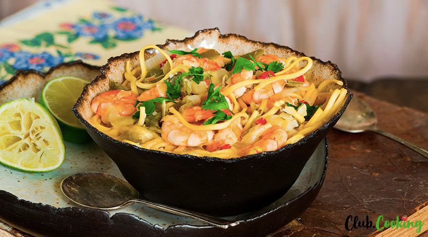 Blending all the major flavor categories of sweet, sour, savory and spicy in one pot makes for one unbelievably inspiring bowl of soup. Filled with carb comforting Chinese noodles and succulent shrimp this is a truly irresistible dish.