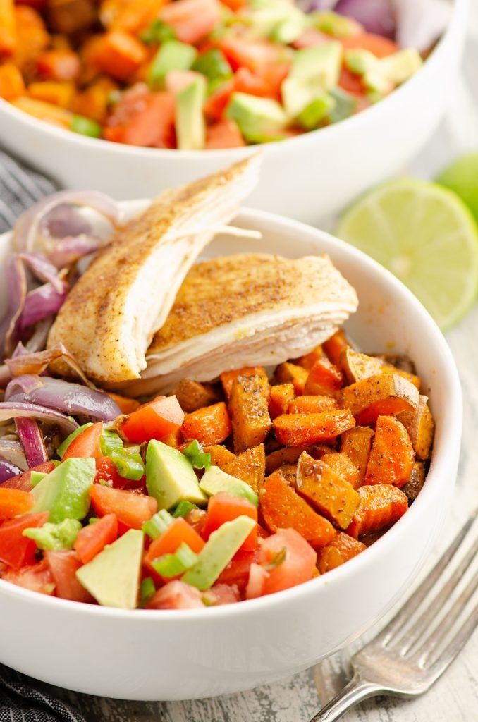 Chipotle Chicken & Southwest Root Vegetable Bowls are a fresh and healthy dinner recipe made with chicken breasts, roasted sweet potatoes, carrots and red onions. The bowls are finished off with a light salsa fresca, avocados and lime juice for amazing fresh flavors!
