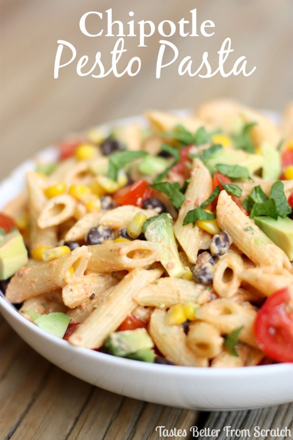 A creamy, smokey chipotle pesto sauce with pasta, beans, corn, tomatoes, avocado and cilantro!
