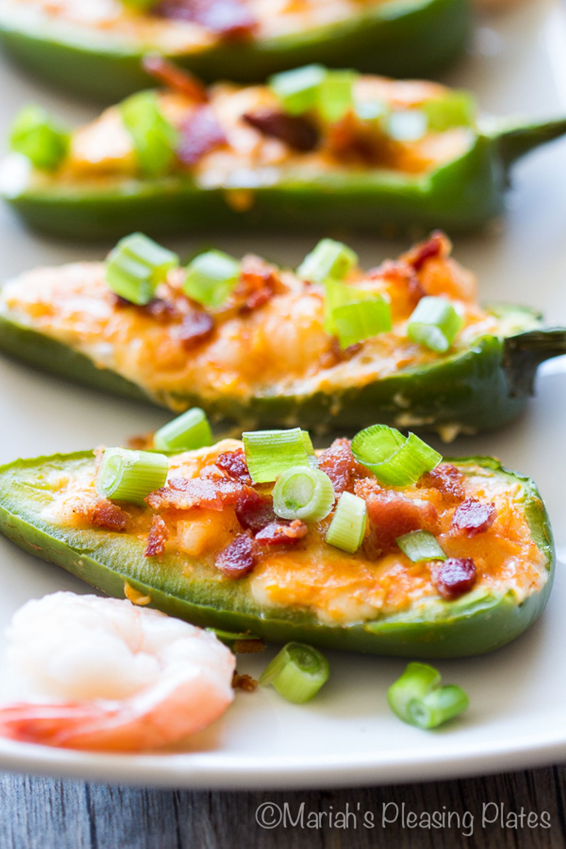 Preheat the oven to 425°. Line a baking sheet with foil, set aside. Cut each jalapeno in half, lengthwise. With a spoon, scoop out the white membranes and the seeds. Chop the shrimp into bite sized pieces....