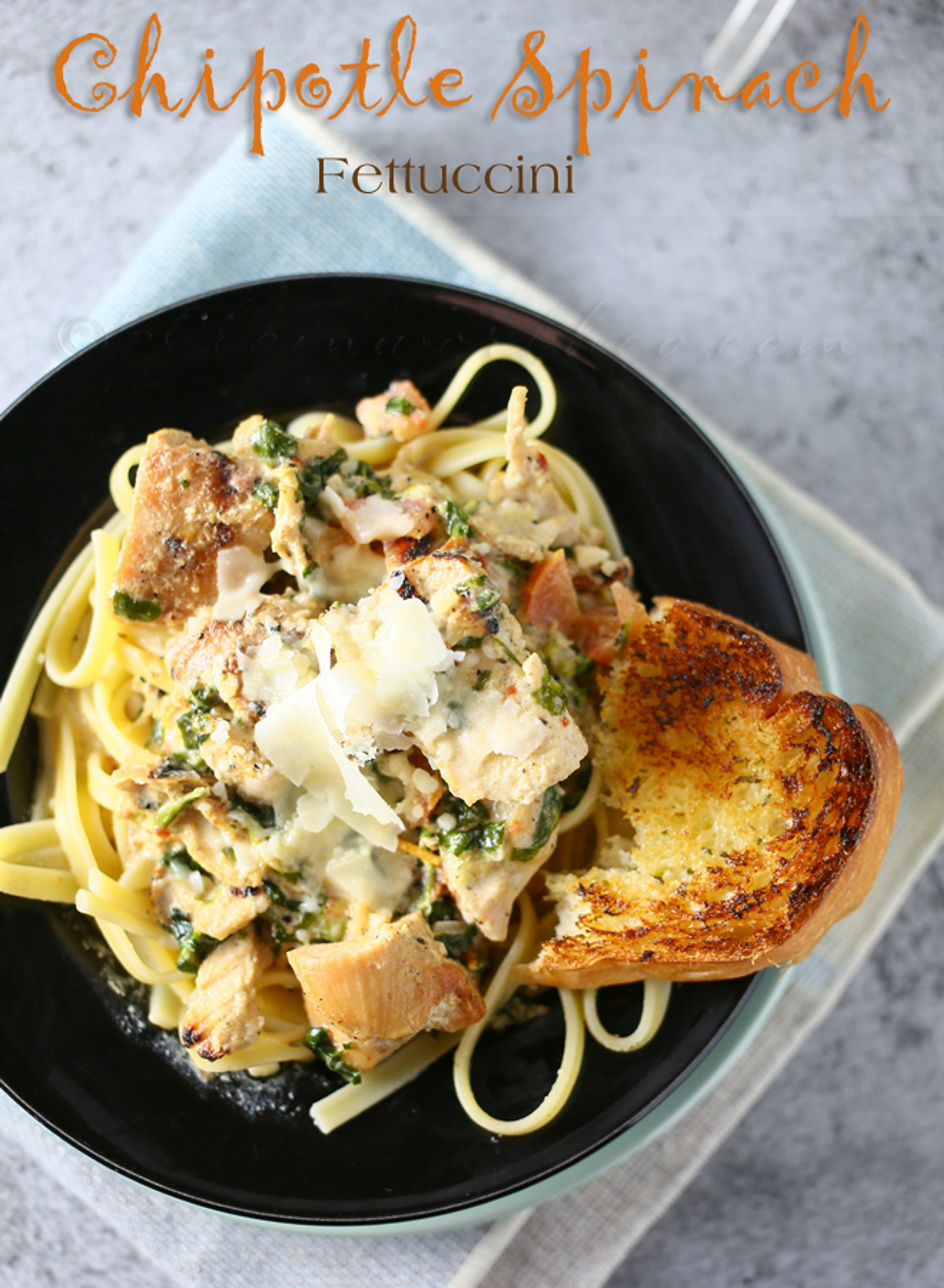 Fettuccini topped with chicken & a chipotle spinach sauce.