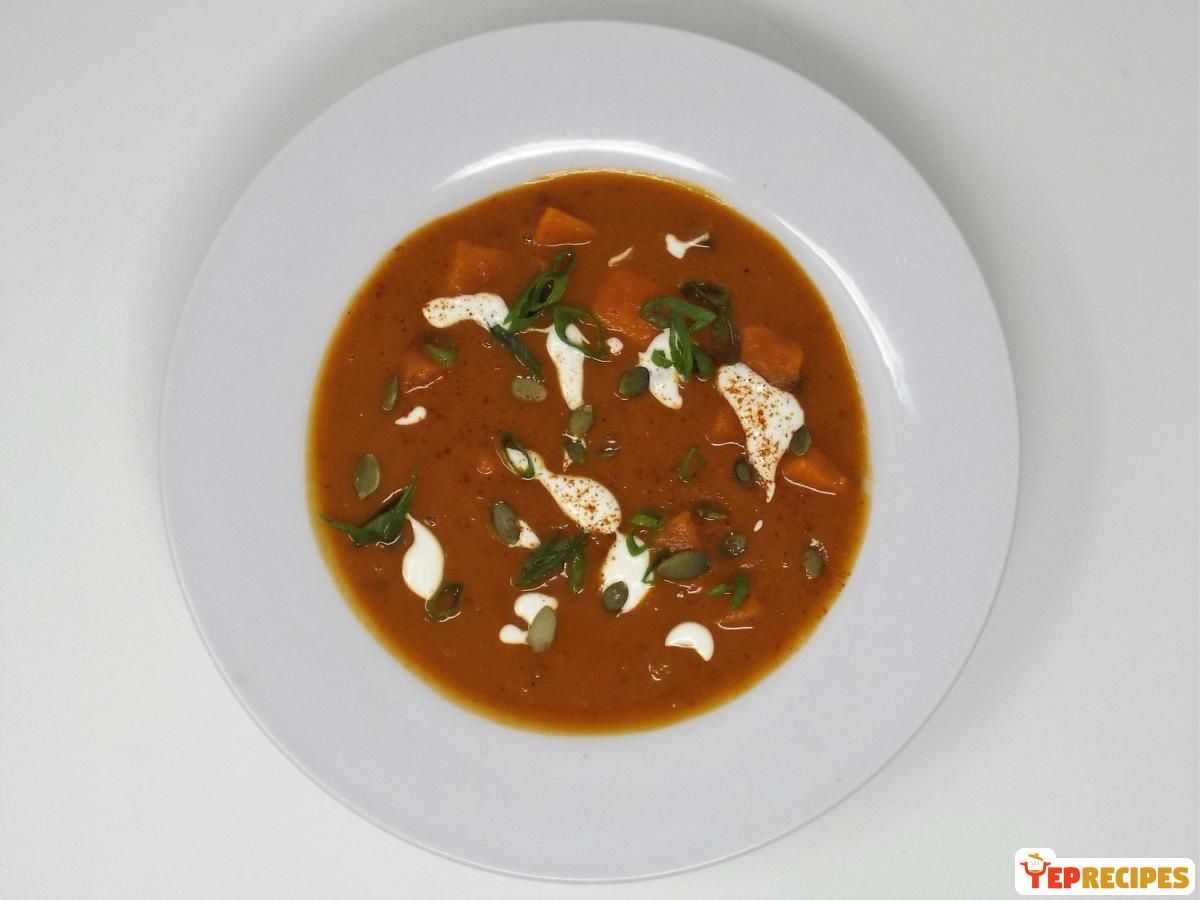 A spicy pureed sweet potato soup with smoky chipotle peppers.