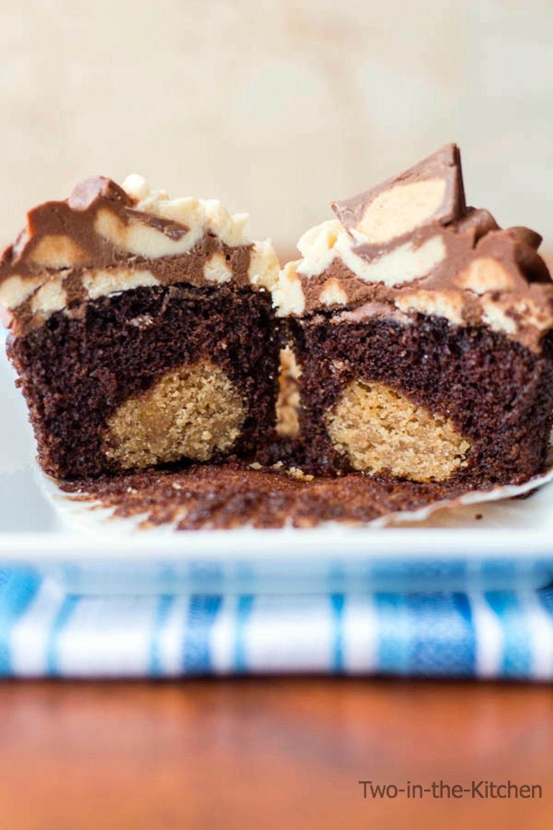 Chocolate cupcakes filled with a peanut butter surprise. A swirled peanut butter and chocolate frosting tops these treats!