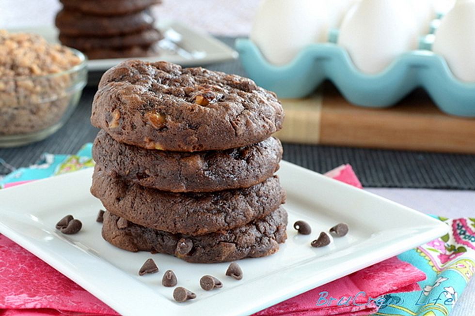 Chocolate cake mix cookies jazzed up with banana and toffee bits