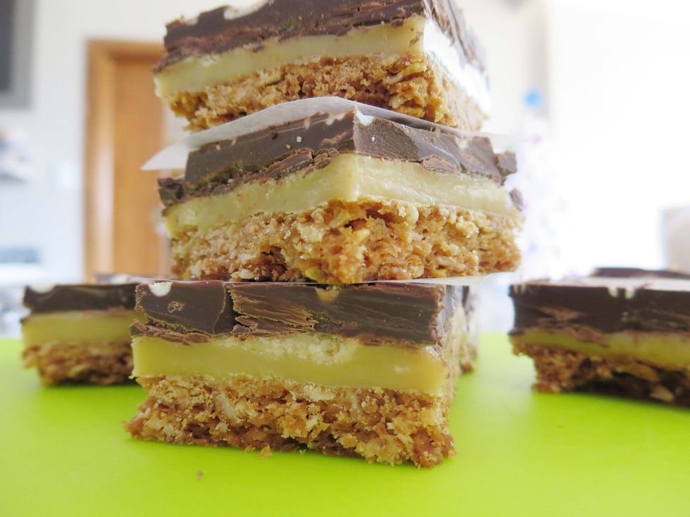 Preheat the oven to 180 °C. Beat together the butter and brown sugar until light and fluffy. Add the syrup and then mix in the flour and oats. Press the mixture into the base of a greased 20 cm square...