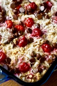 Baked oatmeal filled with tart cherries, chocolate chips and coconut.
