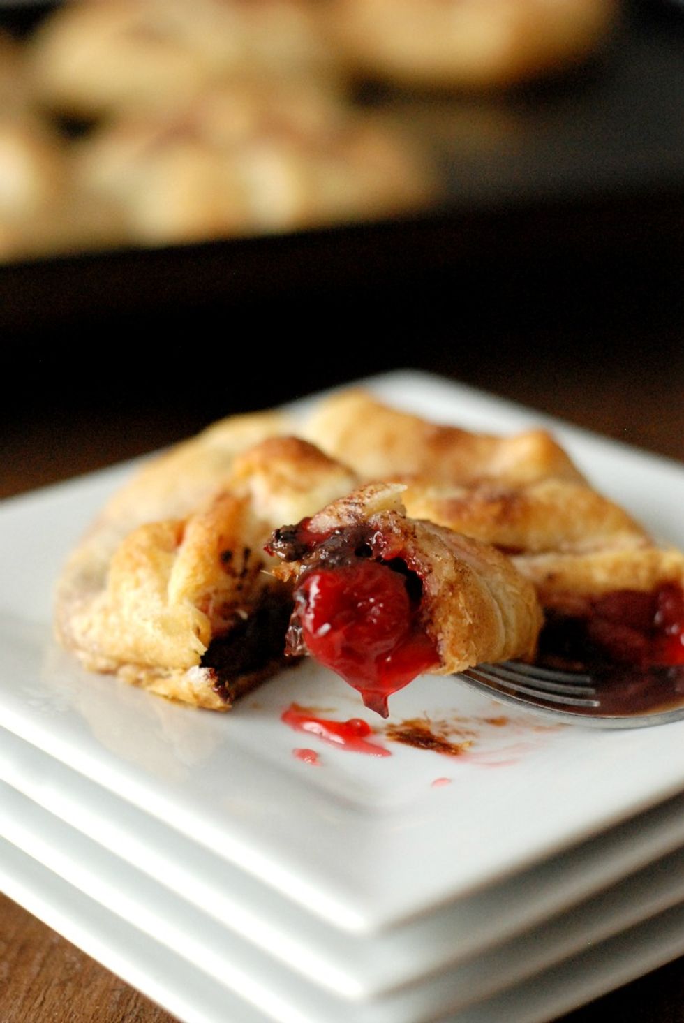 Cherry pie has never been so easy! Flakey Pillsbury Crescent Rolls envelope cherry pie filling and semi sweet chocolate! A sweet and tart dessert!