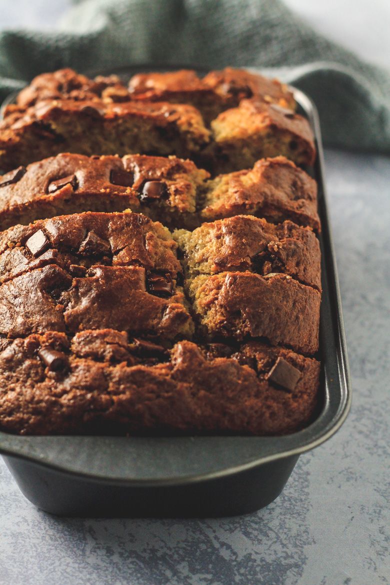 Incredibly moist and dense banana bread that is infused with vanilla, and stuffed full of chocolate chips!