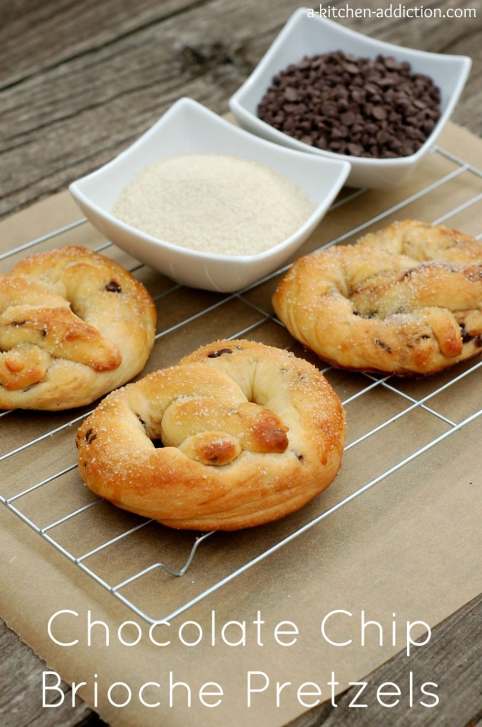 I love soft pretzels and I love brioche rolls, however, until this past week I had never had a combination of the two. I was missing out! (If you haven’t had brioche pretzels, you’re missing out, too!) Chocolate chip brioche pretzels are rich and buttery with bits of chocolate in each bite. Unlike traditional chewy pretzels, these pretzels are tender and flaky. Chocolate Chip Brioche Pretzels Recipe l www.a-kitchen-addiction.com If you eat them warm, which I strongly recommend you do, the brea