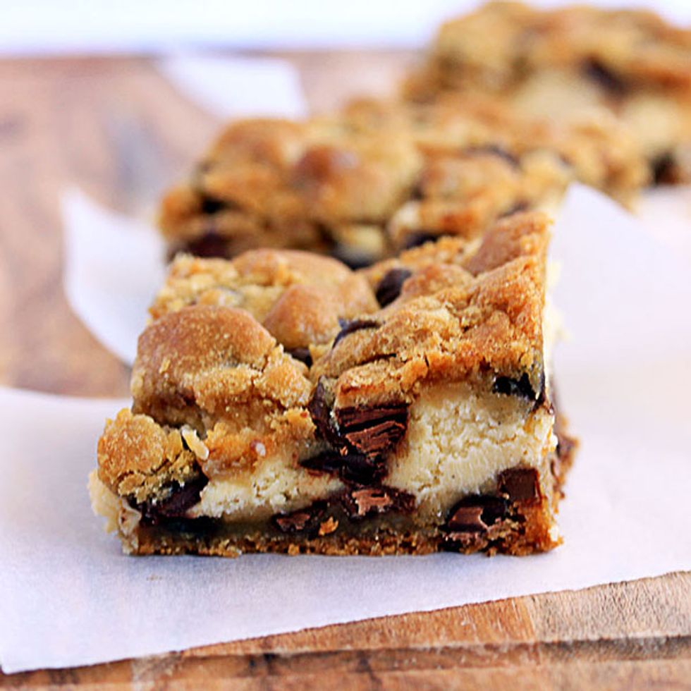 Chocolate Chip Cookie Cheesecake Slice recipe. A scrumptious layer of cheesecake sandwiched between chocolate chip cookie. What could by better?