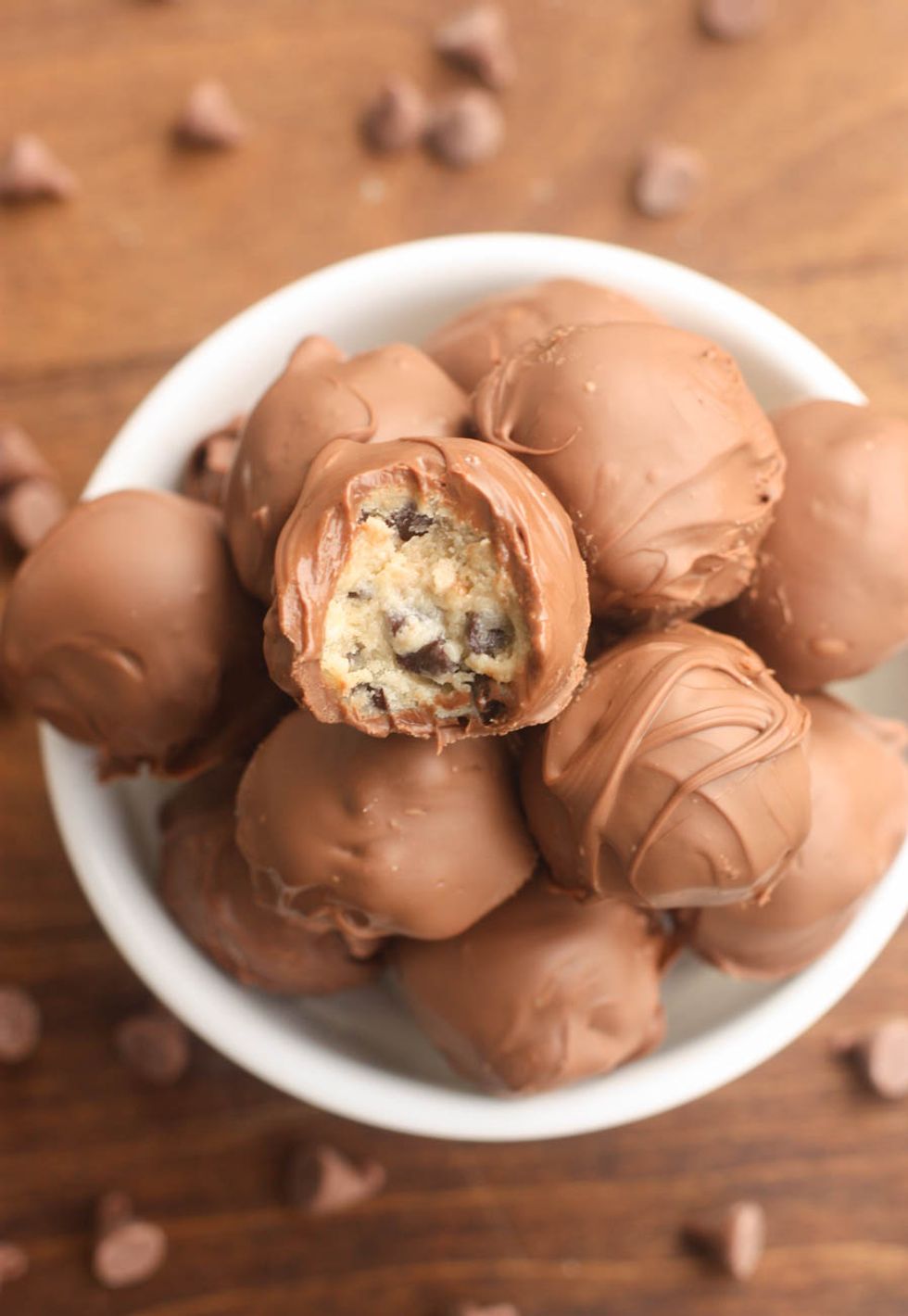 Chocolate Chip Cookie Dough Truffles - A simple egg-free cookie dough dipped in melted chocolate! These bite-size treats are easy and delicious!