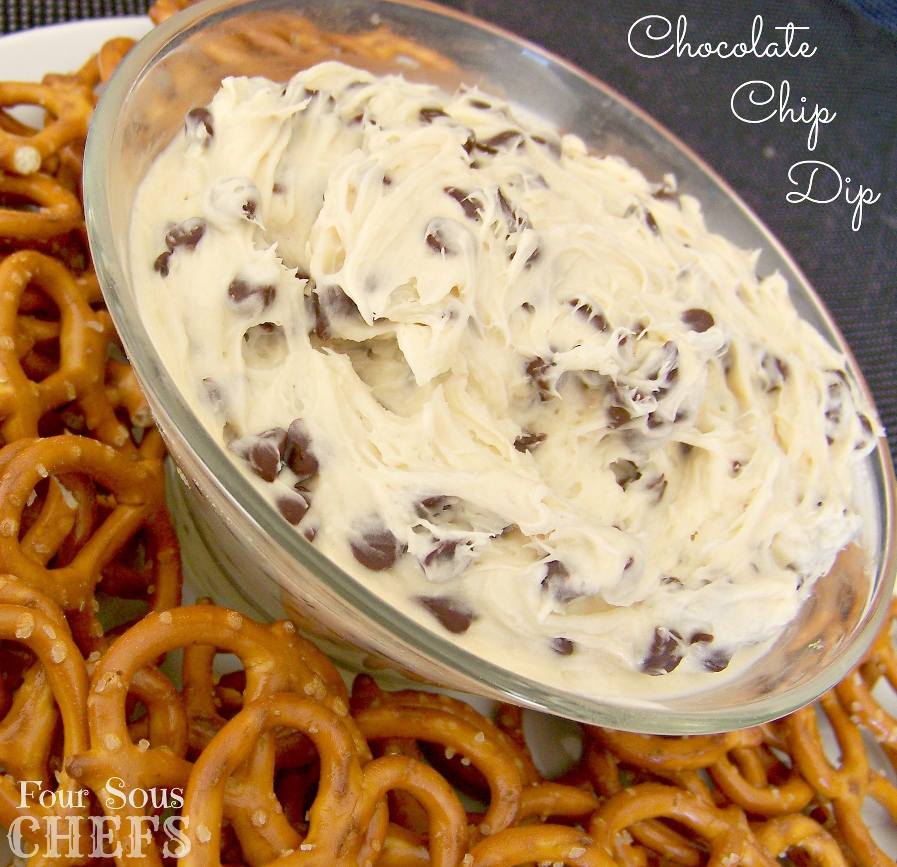 * Cream butter and cream cheese together. Add sugars and vanilla and whip until smooth and creamy. Fold in the chocolate chips. Dip with pretzels.