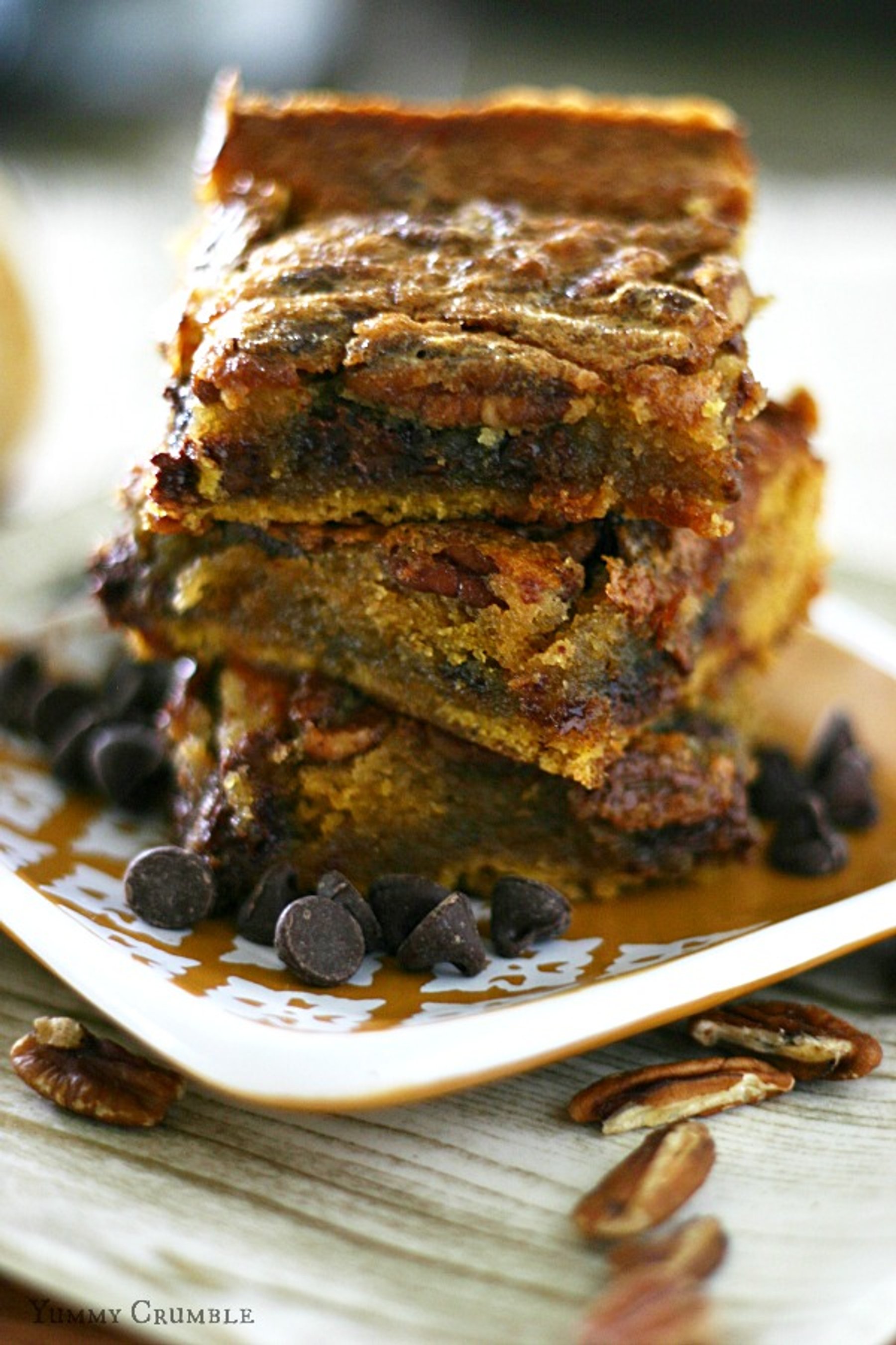 Lovely moist pumpkin bars with gooey and buttery chocolate chip pecan pie filling baked right on top. I’ve taken my two favorite flavors this fall and married them in these Chocolate Chip Pecan Pie Pumpkin Bars.