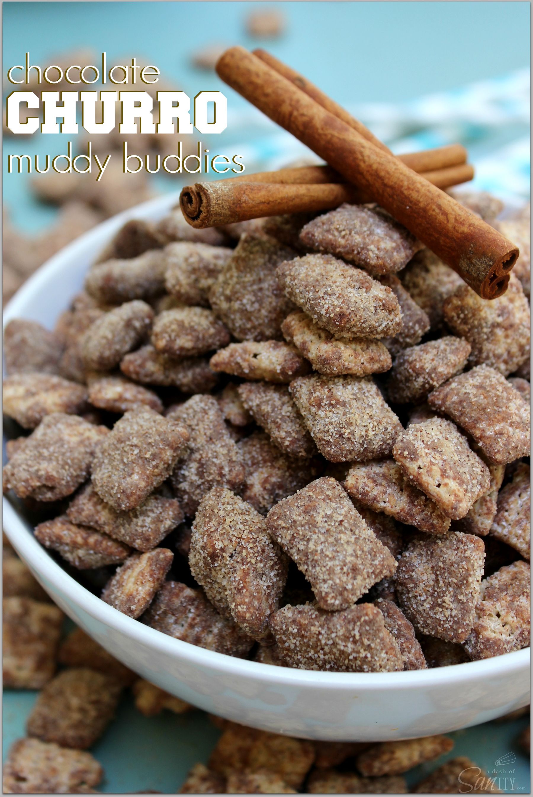 This Chocolate Churro Muddy Buddy is basically a churro wrapped in a chocolate ganache brought to you as bite sized snack.