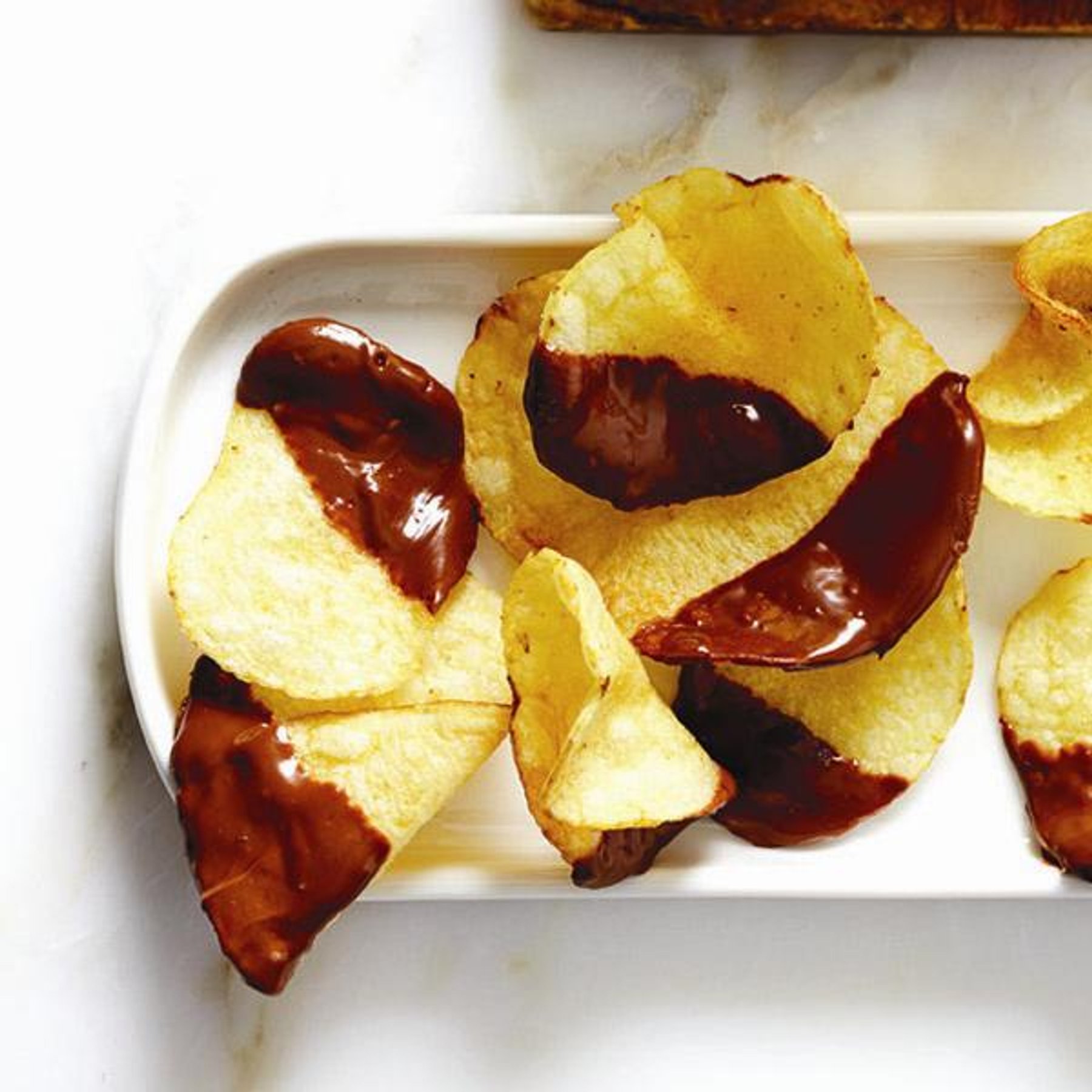 Dip chips from a 220-g package of plain kettle chips in melted chocolate, then arrange 1 in. apart on prepared sheets. Chill in freezer until chocolate is firm, 3 to 5 min.